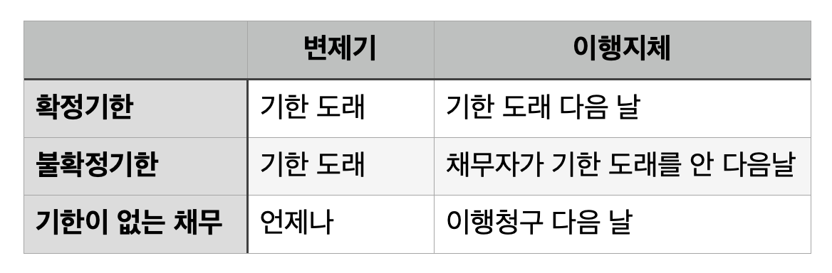 각각을 구체적으로 살펴보면, 이행지체의 성립요건은 ㉠이행기 도래(이행기의 의미는 아래 표 참조), ㉡이행이 가능함에도 지체, ㉢채무자의 귀책사유, ㉣위법이다. 또한 이행불능은 ㉠채권관계 성립 이후에 이행이 불능, ㉡채무자의 귀책사유, ㉢위법의 요건이 성립할 경우 인정된다. 마지막으로 이행거절의 요건으로는 ㉠이행 가능, ㉡진지하고 종국적인 이행거절의 의사, ㉢채무자의 귀책성, ㉣이행거절의 위법이 있다.