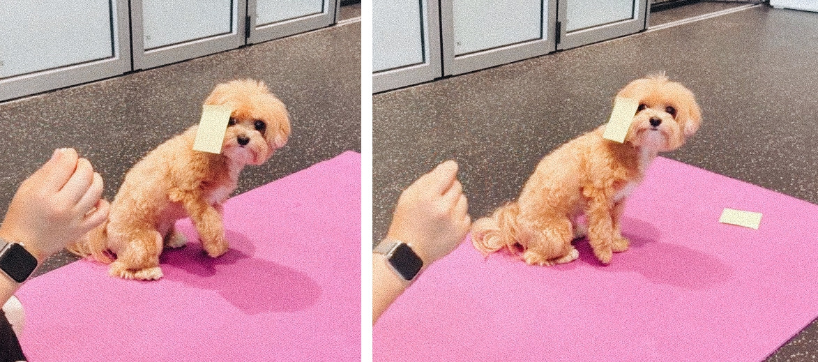 ‘충성’ 하면 강아지들이 눈 옆에 손을 올리며 경례를 하는 개인기는 이렇게 배운다고 해요. 얼굴에 포스트잇을 붙이면, 강아지들이 ‘이게 모야’ 하고 떼려고 손을 올릴 때 ‘충성’하고 명령어를 입히는 거죠. 하지만, 미로는 자기 얼굴에 이딴 걸 붙였다는 모욕감에 손도 들지 못했습니다. 그냥 떼주셨다고 해요.