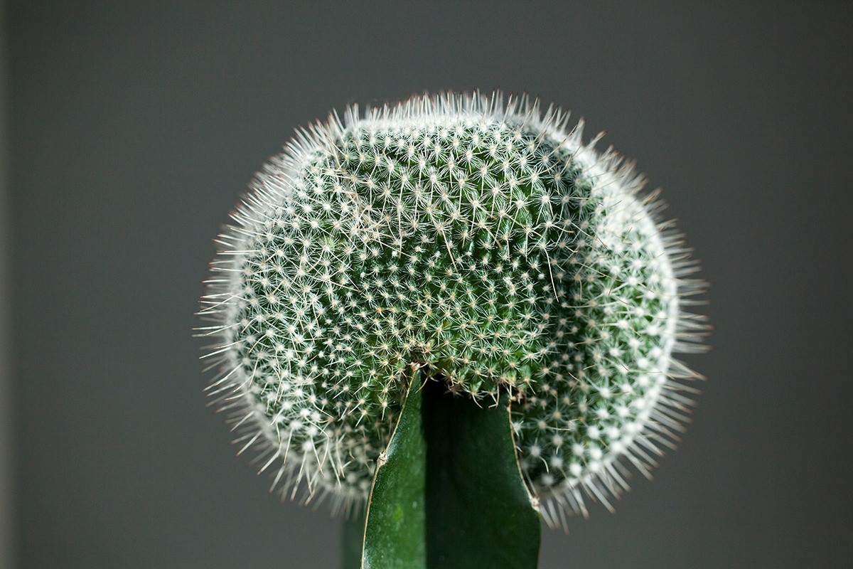 사진 속 선인장도 밍크 선인장처럼 접목과 철화 기술이 모두 동원된 식물입니다. 철화가 일어난 소정 선인장(Parodia scopa ‘Inermis Cristata’)과 삼각주 선인장(Selenicereus triangularis)이 절묘하게 접목되어 있지요. 소정 선인장은 구불구불한 모양으로 철화가 이루어진 것이 아니라 독특하게도 동그랗게 모양이 변했습니다. 접목 선인장의 얼굴이 되어줄 딱 맞는 소정을 고르는 안목과 두 선인장의 생명을 홀로 책임질 튼튼한 삼각주에 안전하게 둘을 접목시키는 기술이 필요합니다. 위, 아래 선인장의 크기와 모양의 조화도 굉장히 중요하죠. 그리고 나머지 마법은 식물에게 달려 있습니다. 이 모든 일은 아무리 기술력이 좋아도 생명을 가진 식물들의 힘을 빌리지 않고서는 일어날 수 없는 일입니다. 멋진 모양의 접목 또는 철화 선인장을 만나려면 최고의 기술과 함께 행운도 따라주어야 하지요. 어떻게 보면 인간과 자연이 힘을 합쳐 만들어낸 결과이기도 합니다. 접목과 철화로 특별한 모양을 갖게 된 식물들을 보면 원하는 식물의 형태를 만들기 위해 온갖 기술을 동원하는 인간으로서의 미안함과 그런 인간의 자극에도 적응해 강한 생명을 이어가는 식물에 대한 경이감이 함께 듭니다.