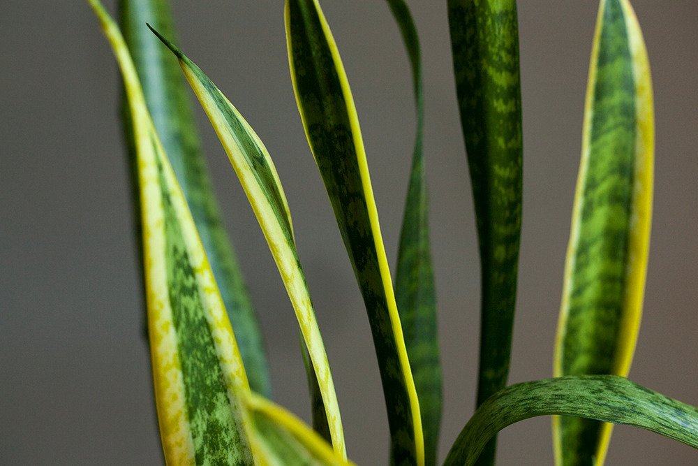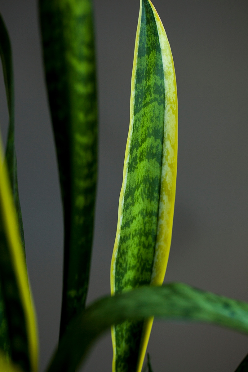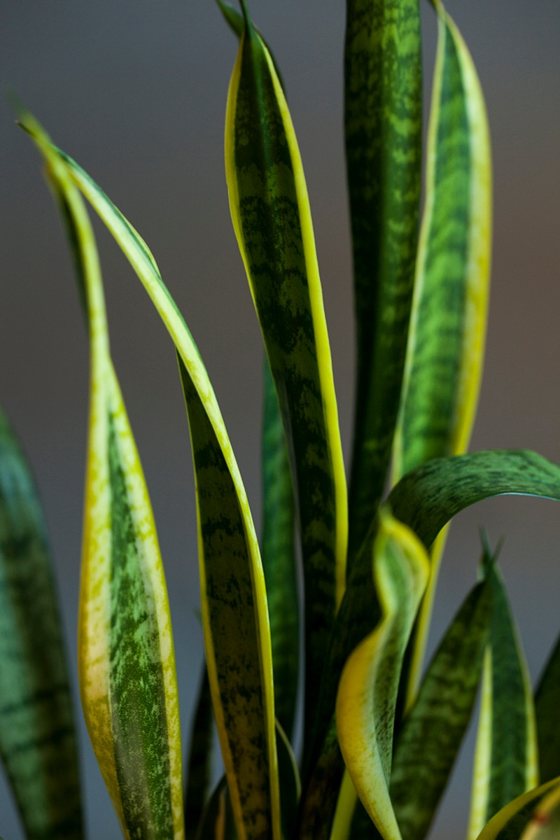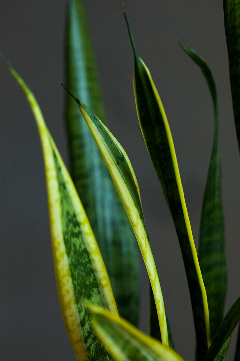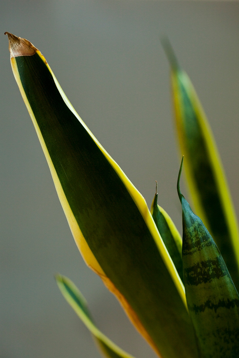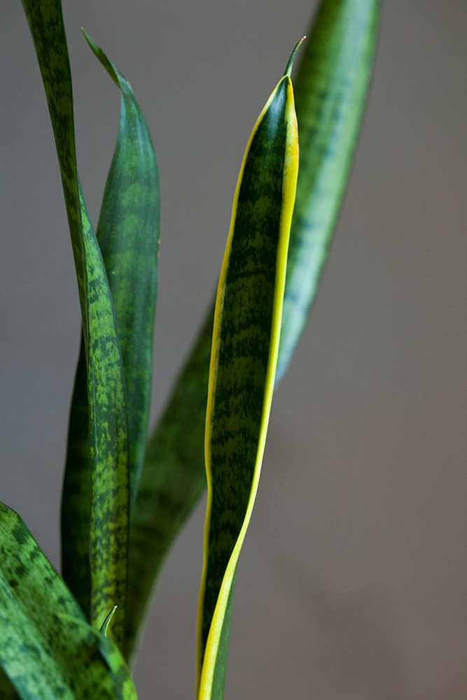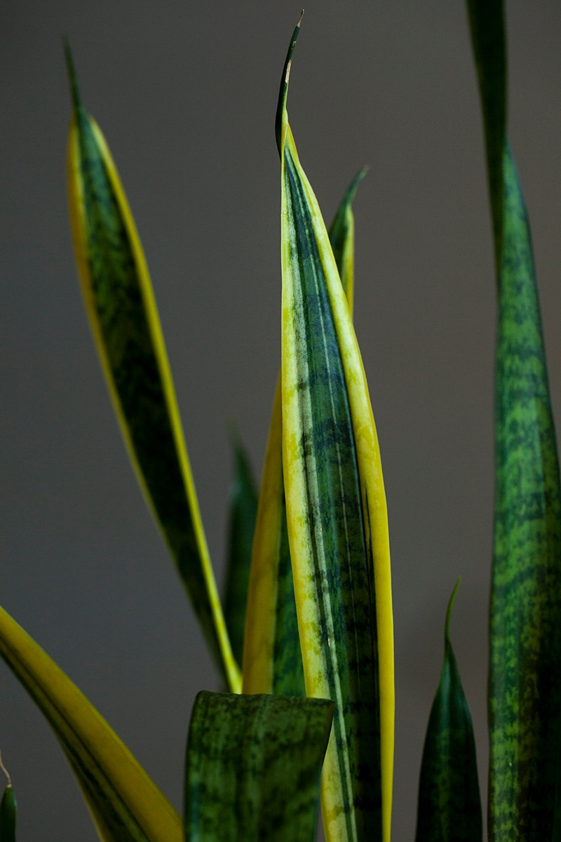 산세비에리아의 매력은 역시나 그 오랜 방관에도 거뜬히 살아남는 생명력입니다. 그러나 사진을 찍으면서 비로소 알게 된 또 하나의 매력은 (사실 모든 식물이 그렇지만 특히 산세비에리아는) 모든 잎들의 색깔과 모양이 의외로 정말 다양하다는 것입니다. 노란 테두리를 가진 잎, 제각각의 얼룩무늬가 강렬한 잎, 진한 초록색의 잎, 연한 초록색의 잎이 모두 한 화분 안에 담겨 있습니다. 노란 띄와 얼룩무늬 자체도 넓이와 명도가 다르고, 잎꽂이를 해서 새로 나오는 잎에는 테두리나 얼룩무늬가 나타나지 않는 특성도 있어 한 화분 안에 똑같은 잎이 하나도 없습니다. 긴 시간을 들여 산세비에리아를 찍으며 관찰하지 않았다면 이만큼의 다양함은 발견하지 못했을 것입니다. 알았더라도 특별히 다가오지 않았겠죠. 우리나라에서는 공기 정화 식물의 대표로, 서양에서는 뱀 식물(snake plant)이나 시어머니의 혀(mother-in-law’s tongue) 같은 다소 애꿎은 별명으로, 미모와는 상관없는 이미지를 갖고 있지만, 사실 산세비에리아는 꽤 역동적이고 화려한 잎이 자랑인 식물이었습니다.