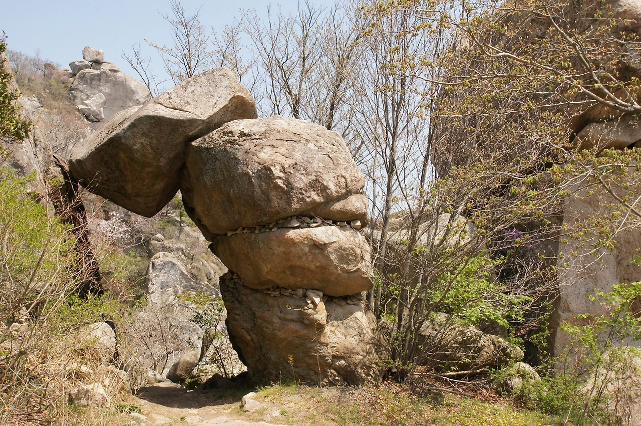 샛길을 얼마 안 걸어 기이하게 생긴 바위(기암)가 나타났다. 보리암 뒤편으로 장군봉이 버티고, 그 앞에 형리암이 머리를 숙이고 있다. 기암이 그 바위를 흉내 내다, 옆 바위에 머리를 들이박았다. 나는 이 기암을 볼 때마다 실소를 금치 못했다. 왼쪽에는 바위가 금산 20경 좌선대가, 오른쪽에는 21경 삼사기단이 자리 잡고 있다. 다만, 좌선대와 삼사기단은 사진으로는 일부분만 보인다. 이 아치문을 통과해야 원래 길과 만나 금산 산장으로 갈 수 있다.