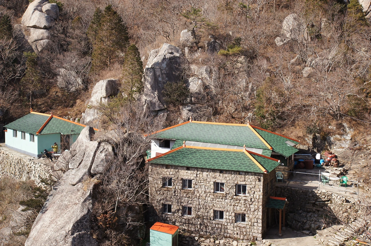 좌선대와 삼사기단 사이에 있는 기암을 지나 조금 더 걸으니 금산 산장의 야외 테이블이 보였다. 요즘 핫 플레이스로 떠오르는 곳임을 증명하듯, 젊은이들이 컵라면을 먹으며 인증샷을 찍고 있었다.