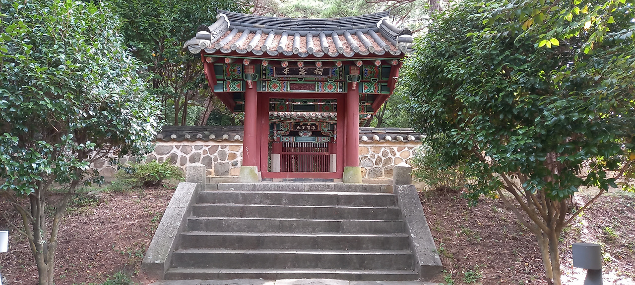 사당 입구로 가는 길 양쪽에는 육송들이 줄지어 서 있어 장엄한 분위기를 연출했다. 그중 대부분은 반송(만지송)으로, 정제된 분위기를 자아냈다. 몇 년 전 방문했을 때는 소나무 아래 맥문동 연보라 꽃들이 만발하여 매우 이채로웠다.