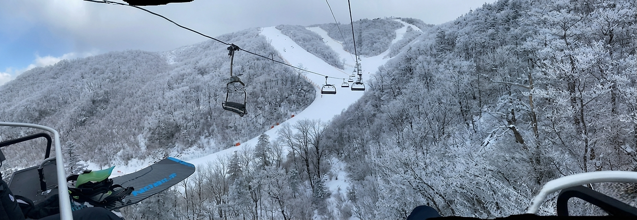 눈이 내려앉은 슬로프 전경이 보인다.