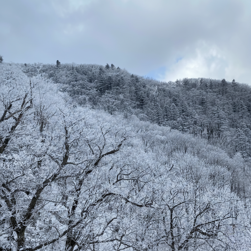 새하얀 눈송이로 가득한 나무들로