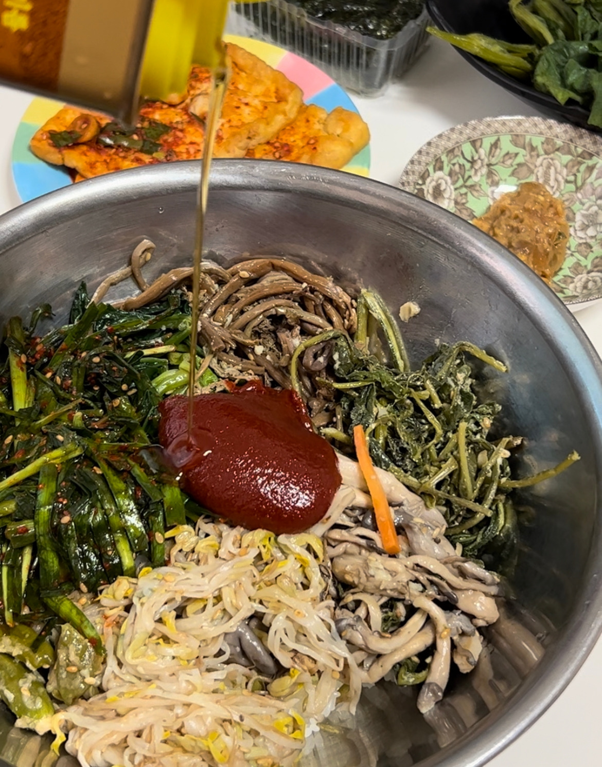 나물을 정갈하게 세팅하고 된장찌개 끓여서 먹을까 하다가 노선을 변경해 양푼 비빔밥을 해 먹기로 했다.
