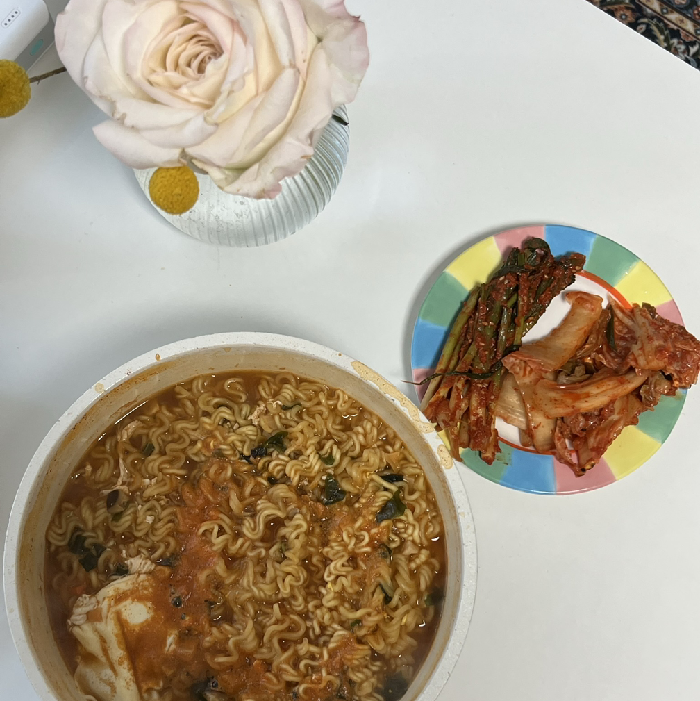 보글보글 끓을 때, 엄마가 보내준 파김치와 묵은지를 접시에 덜고 라면 불을 끈다. 첫 입은 국물, 그다음은 계란. 속이 시원해지는 기분. 오늘도 잘 먹었다!