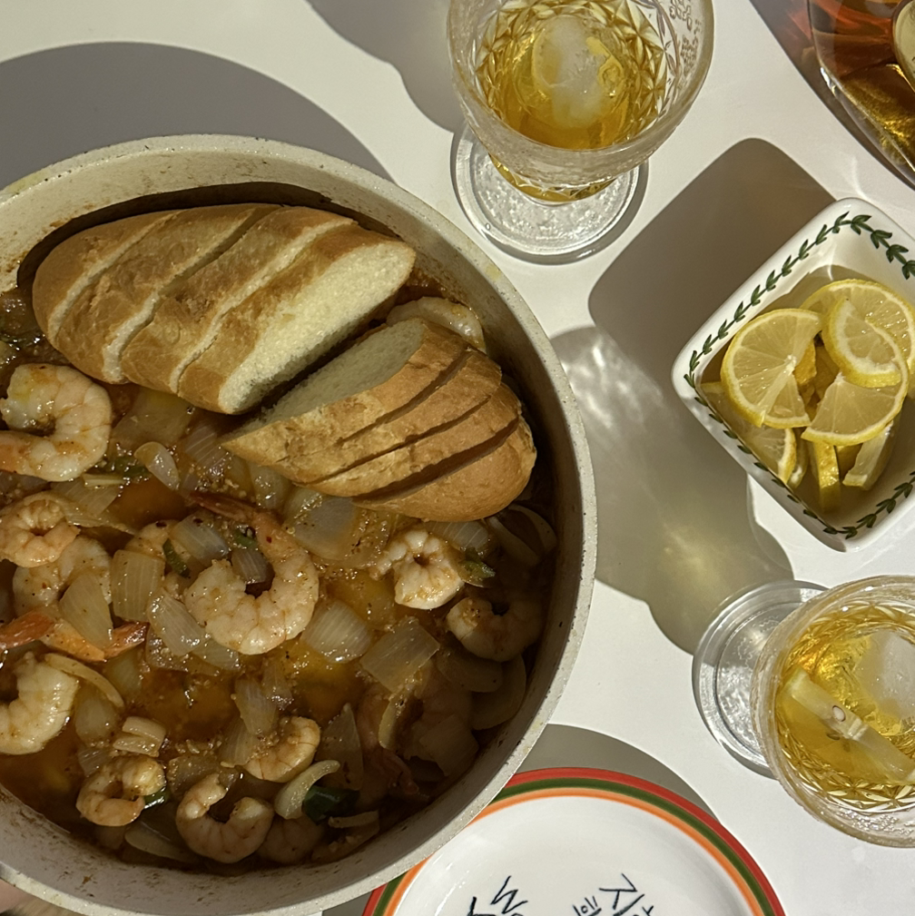 완성된 감바스에 구운 바게트 빵을 올려주면 먹음직!
