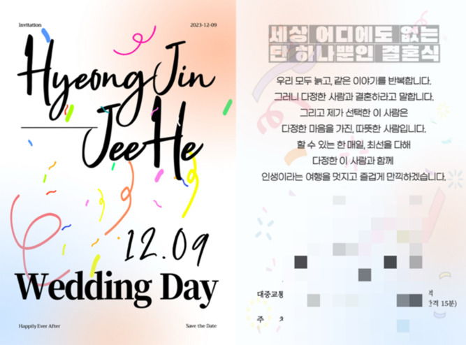 아! 물론 어른들용(?) 청첩장은 따로 뽑았다. 뭔가, 파티 초대장을 어른들에게 돌리는 것은 조금 예의가 아닌 것 같아서 양가 부모님과 상의하에 따로 제작! 어른들용 버전 또한 모두가 만족했다.