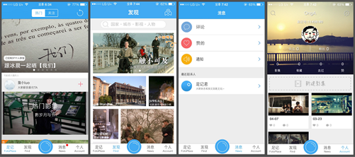 초기의 FotoPlace는 최근 버전에 비해 비교적 심플한 구성을 갖고 있었다. 그렇다 해서 단 순히 ‘심플’ 한 것은 절대 아니다. 그때도 콘텐츠 자체가 뭔가 통일감 없다는 느낌을 많이 받았었다. 어떤 것은 이미지로만 보이고 어떤 것들은 블로그 형식으로 되어 있었다. 아마도 초기에 FotoPlace가 자신의 메인 콘셉트를 명확히 하지 못해 그러한 상황이 나타난 것이 아닌가 싶다. 영화 컷 연출과 영화 촬영지 여행정보, 두개의 메인 테마를 같이 가져가려고 했던 것이 서로 조화를 못 이루었던 것이다. 다행히 영화 컷을 콘셉트로 한 카메라 기능이 선풍적인 인기를 얻게 되면서 앱 자체도 촬영지 정보보다는 카메라 기능에 훨씬 더 주목되어있다는 느낌을 주었다. 그래서 처음에는 인스타그램의 영화 테마 버전이라는 느낌이 많이 들었다.