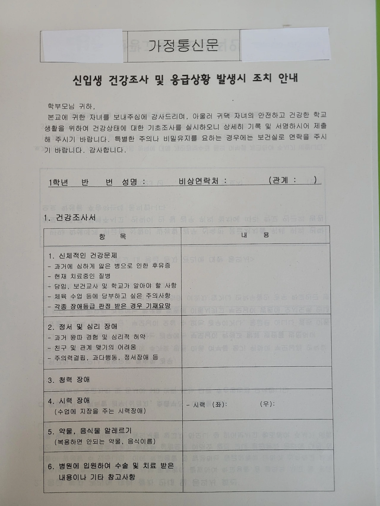 보건실도 꼭 받아두어야 할 가정통신문이 있다.