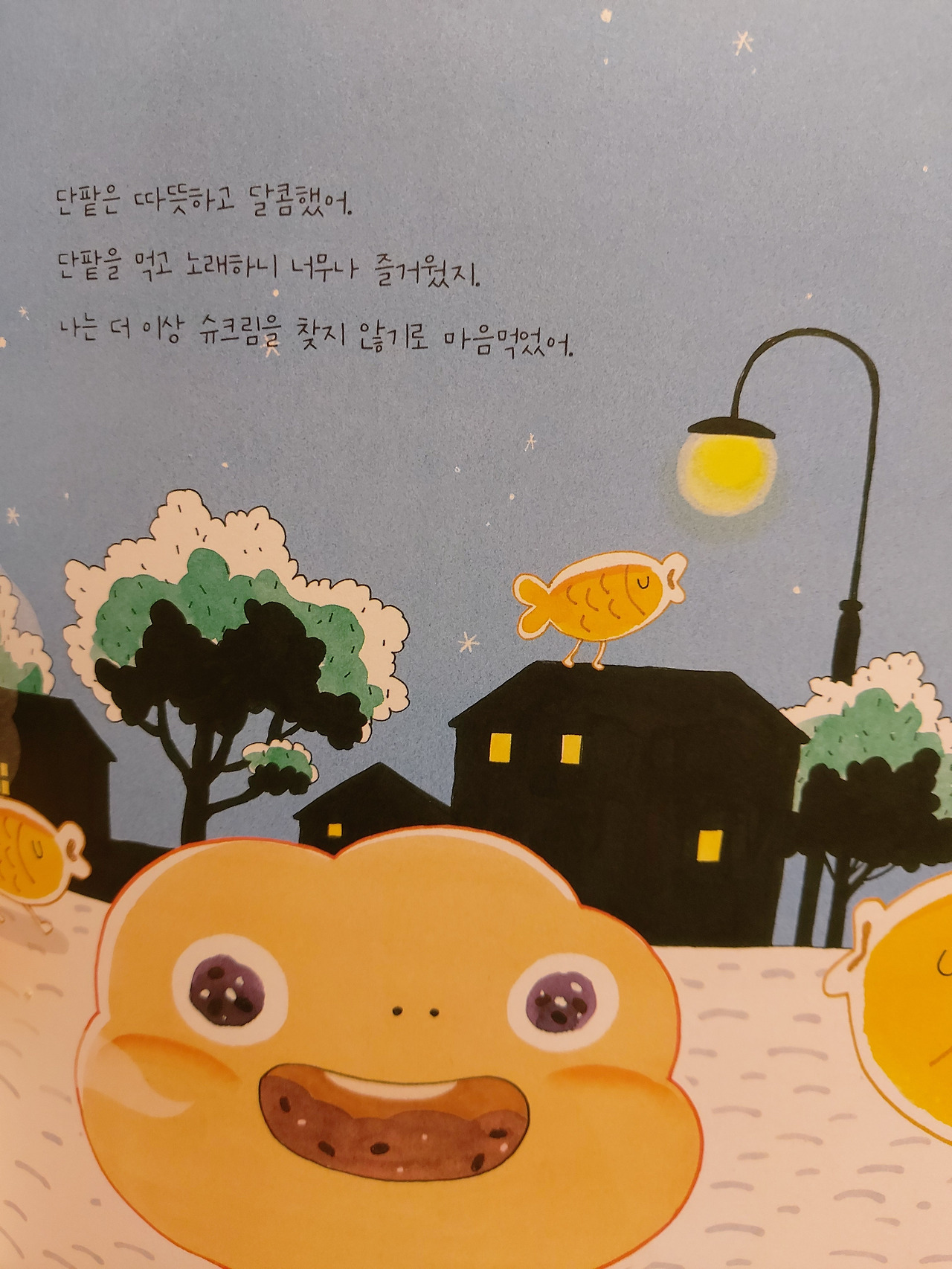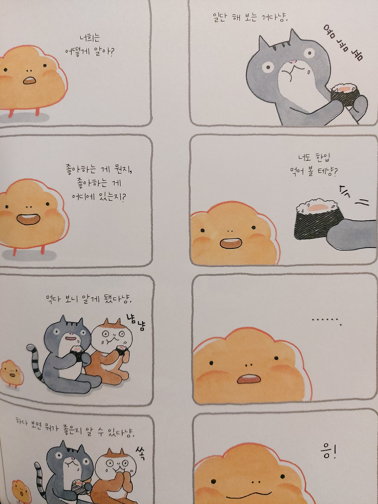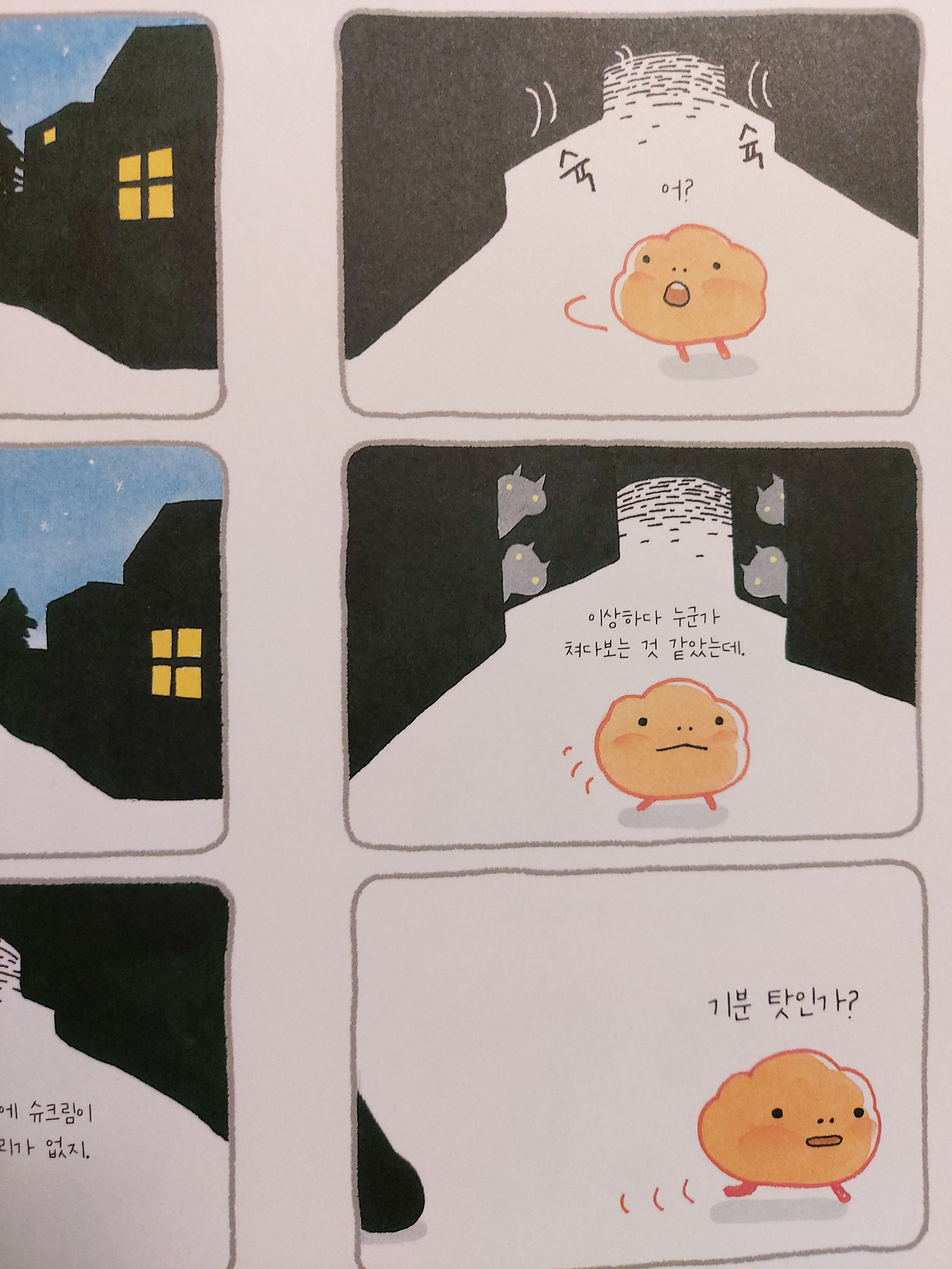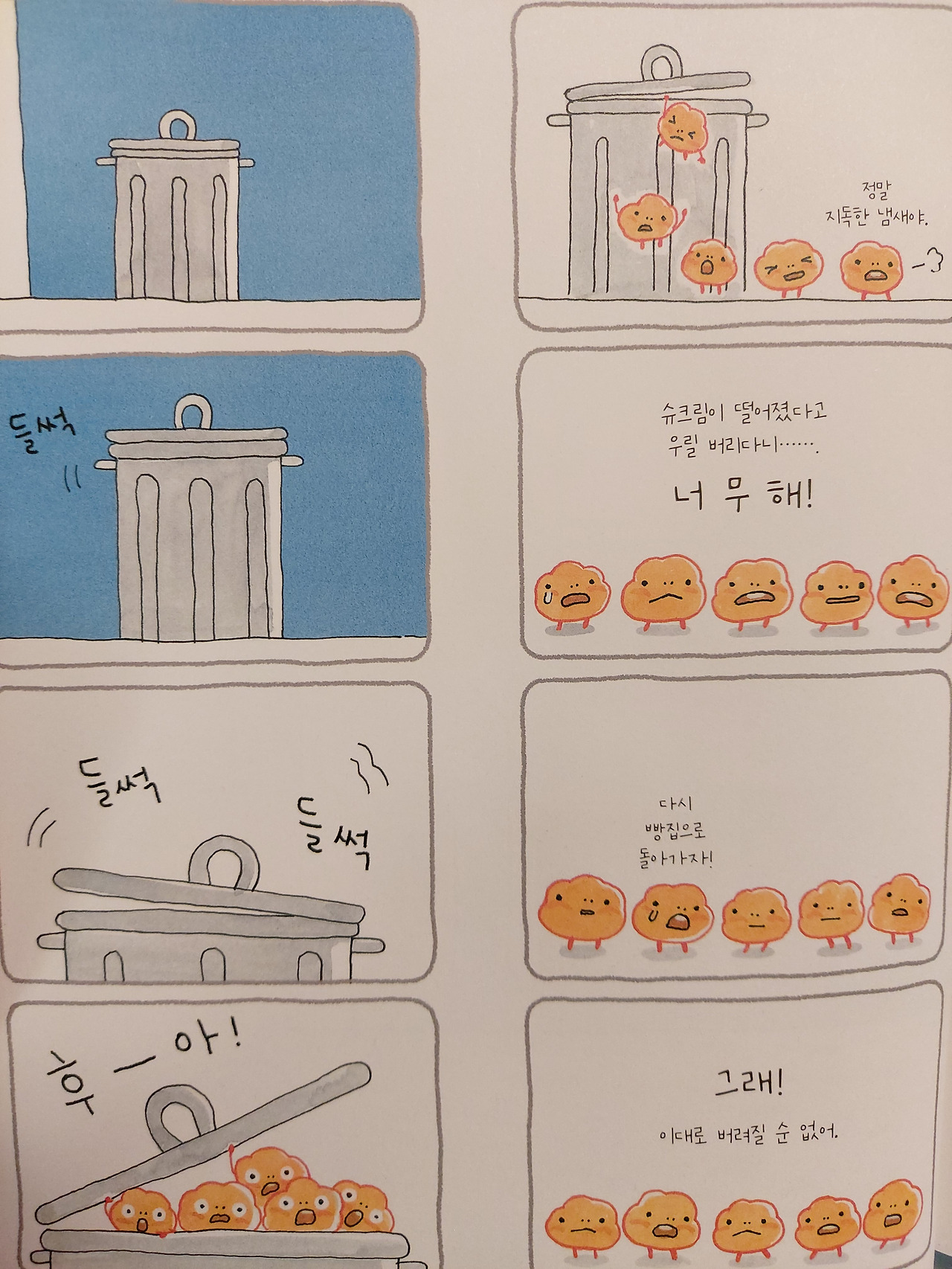 그림책의 표지부터 눈길을 끈다. 오동통한 슈크림빵들이 하하 호호 입을 헤~ 벌리며 나를 반겨주는 모습. 아이와 일산 교보문고서점에 방문한 날, 발견한 책이다. 귀여운 그림의 귀여운 글자들을 보고 첫 장을 넘겨본다. 일반 그림책 과는 다르게 만화책의 구성으로 이루어져 있다.