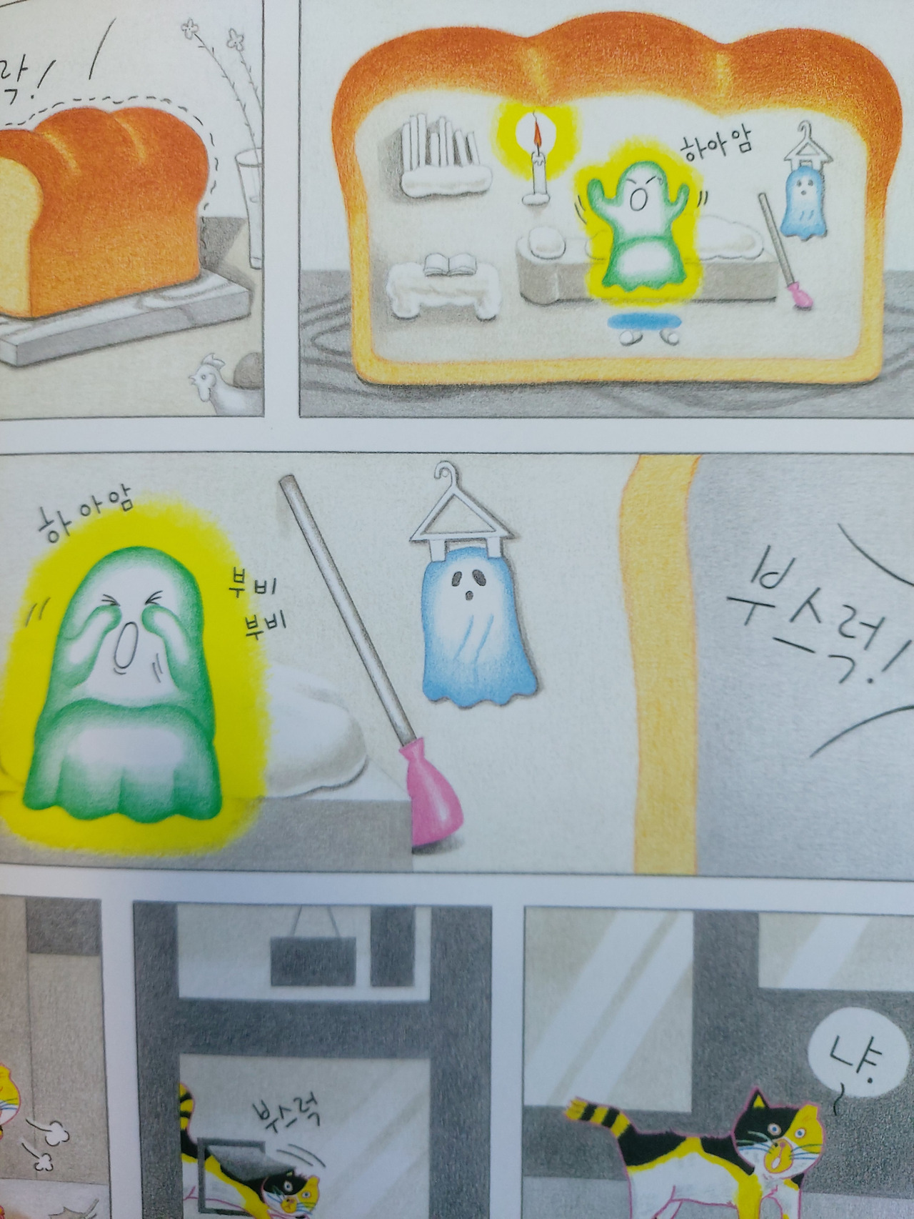 고양이 이 녀석.. 혼줄을 내줄테다. 벼르고 있는데, 고양이가 아니라 날카롭게 생긴 쥐를 보고 깜짝 놀란다. 식빵을 야금야금 먹어치우는 쥐에게 발을 동동거리며 어쩔 줄 몰라하는데, 그 때 고양이가 나타난다. 자신의 집인 식빵을 지켜준 것이다. 고양이 덕분에. 식빵유령은 처음으로 고양이에게 고마움을 느낀다.