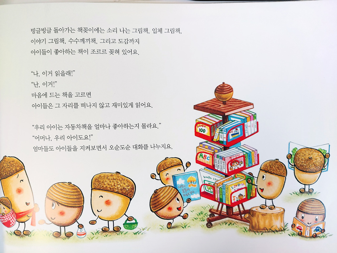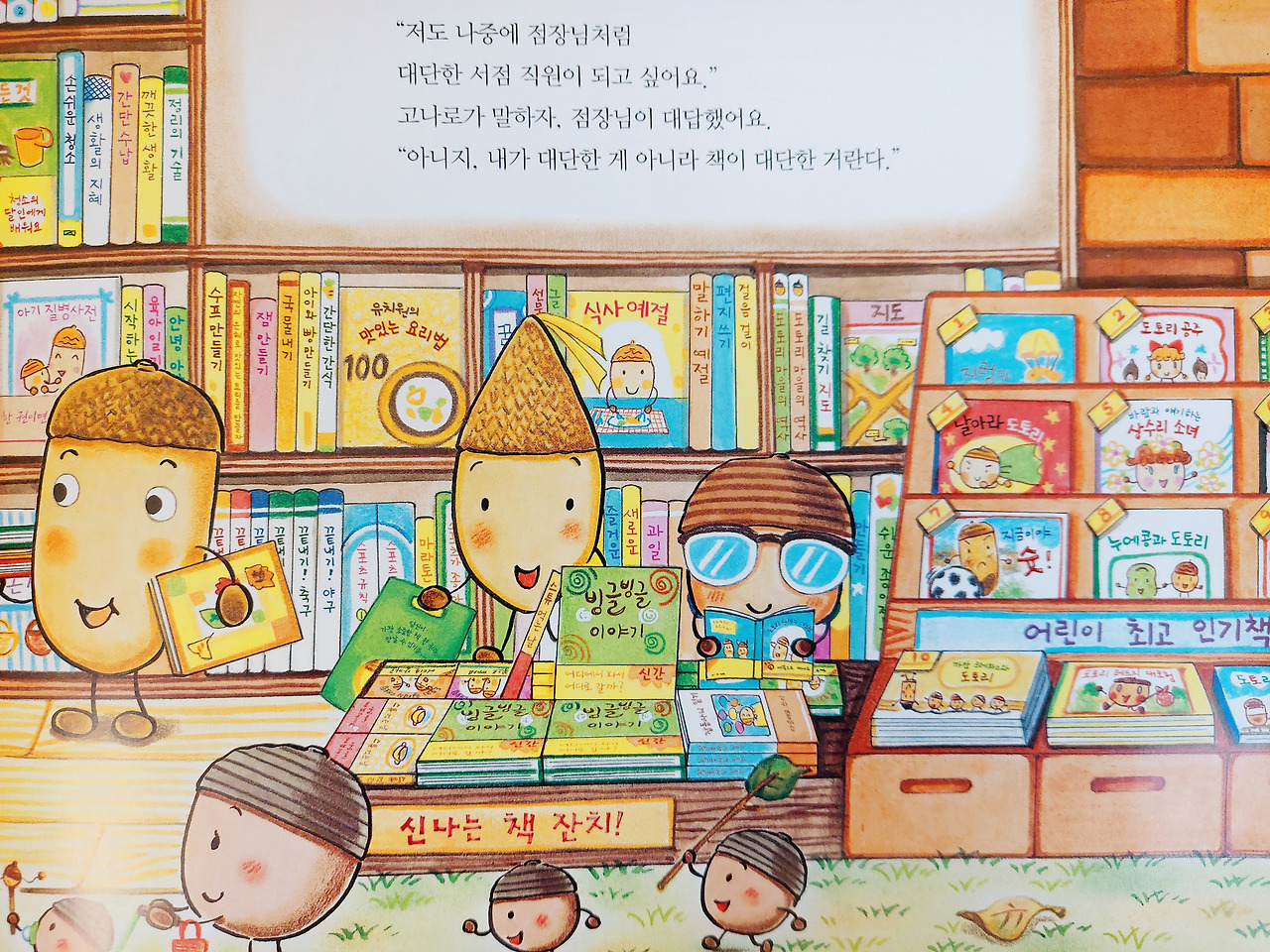 다시 도토리 마을의 서점으로 돌아온다. 부지런히 책들을 정리하고 나면 서점문을 열 시간이다. 동그란 안경을 쓴 누리가 ‘어서 오세요~’ 반갑게 인사를 건넨다. 아기자기한 서점의 모습이 보인다. 전면책장에 진열된 재미난 책들, 책꽂이에 가지런히 꽂혀있는 책들, 새로 나온 책도 볼 수 있다. 서점에서는 서로 좋아하는 책들을 이야기할 수 있고, 빙빙 돌아가는 회전책장 주변에는 꼬마손님들이 좋아하는 책을 고르고 책을 본다. 아이들 주변에는 엄마들이 책에 관한 이야기를 나누고 엄마 등에 업힌 아기는 콜콜 잠을 자지만 이런 분위기를 매번 접할수록 갓난 아기들도 곧 책을 좋아하게 될 것이다.