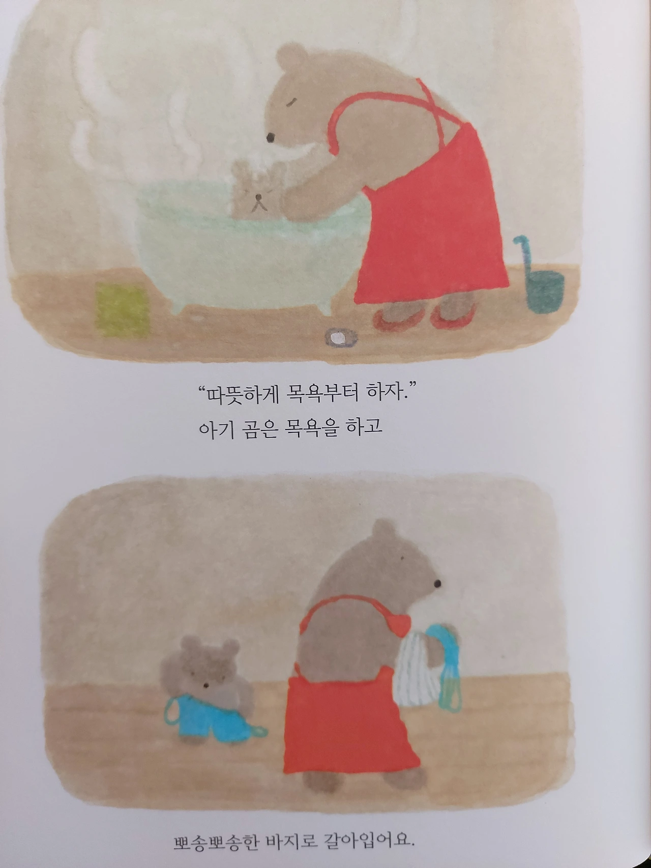 따듯한 목욕물로 목욕을 하고 깨끗한 새 옷으로 갈아입고 엄마와 이런저런 이야기를 나누며 저녁밥을 먹는 아기곰.