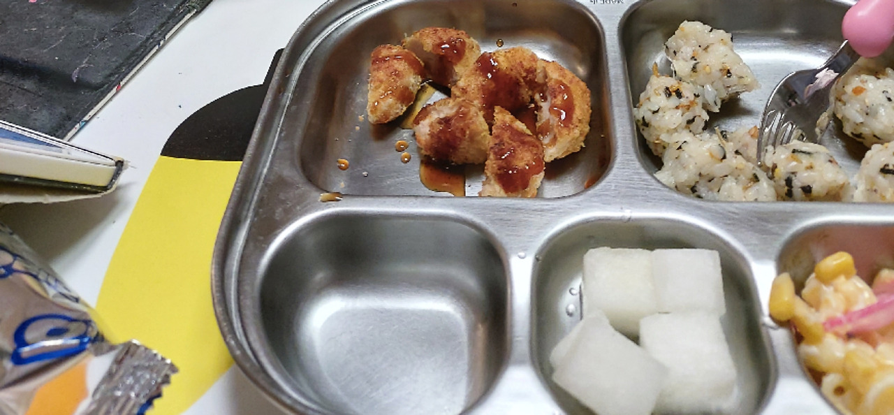 내가 하기 힘든 반찬들이 있다. 검은콩조림, 나물류는 하게되어도 안먹고 썩히게되거나 결국은 버리게 되기때문에 사더라도 소량만 구매한다. 반찬가게에서 아이가 좋아하는 콩조림, 장조림, 꼬꼬밥(닭고기로 만든 볶음밥) 등을 산다. 반찬의 양은 많지 않다. 예전 아이가 어릴때 사용하던 이유식 보관용기에 조그만 양의 반찬들을 넣어둔다. 어린이집에서 하원한 둘째의 오늘의 입맛은 어떨까? 두칸짜리 식판에 검은콩조림, 꼬꼬밥을 쓱쓱 비비 준비해둔다. 집에 오는길에 뽀로로주스로 허기를 채운 덕분인지 밥을 보고서 별 감흥이 없다.