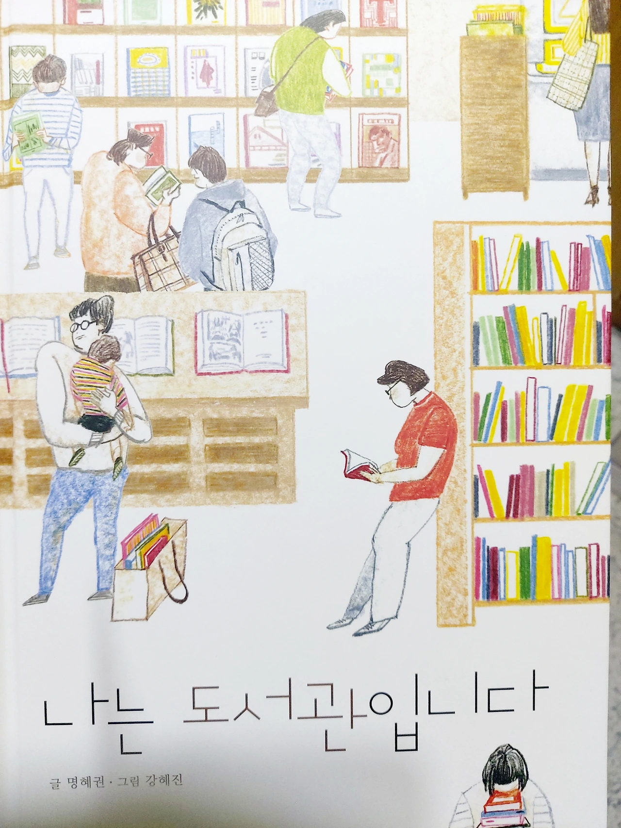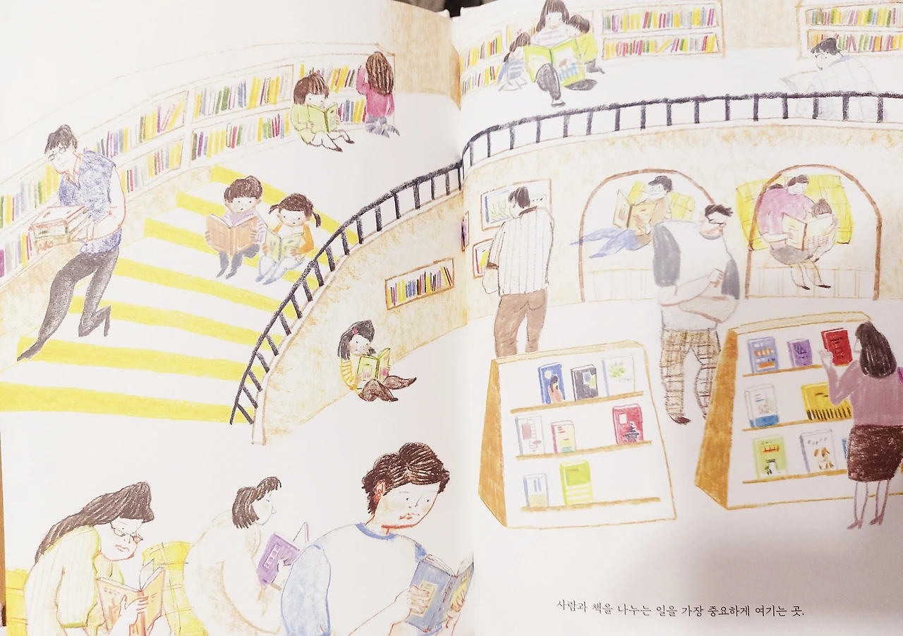 내가 자주 가는 일산의 알라딘 중고서점을 연상하게 하는 그림이다. 널다란 둥근 코너를 따라 사람들이 서 있다. 책을 보고 앉아 있다. 아이와 함께 책을 고르고 아기를 안고 있는 모습도 보인다. 딱 규격화된 정형화된 공간이 아니라 여유있고 유하게 편안한 공간. 엄마도 아기도 안아주는 그런 공간을 꿈꾼다. 알라딘 중고서점처럼 도서관에도 책바구니가 있으면 좋겠다. 한 사람당 대출할수 있는 권수는 20권. 다양한 책을 많이 빌릴수 있는 기회가 생겼다면 많은 책을 담고 빌릴수 있도록 책바구니도 준비되어야 할 것이다. 그래야 한권두권 내 양팔로 끌어안아도 넘치는 책들을 담을 수 있을테니까.