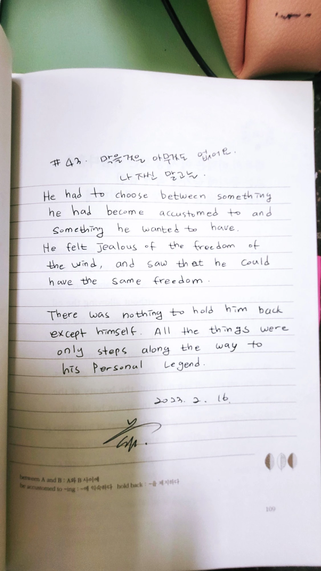 누구에게나 하고 싶은 일이 있다. 나에게는 영어가 그랬다. 어느날 알고지낸 더블엔 출판사 대표님이 책 한권을 선물로 주었다. <하루10분 100일의 영어필사>이 바로 그 책이다. 초록색 띠지를 한 그 책은 내 마음에 들어왔다. 그리고 나는 영어필사를 해볼까? 생각이 들었다.