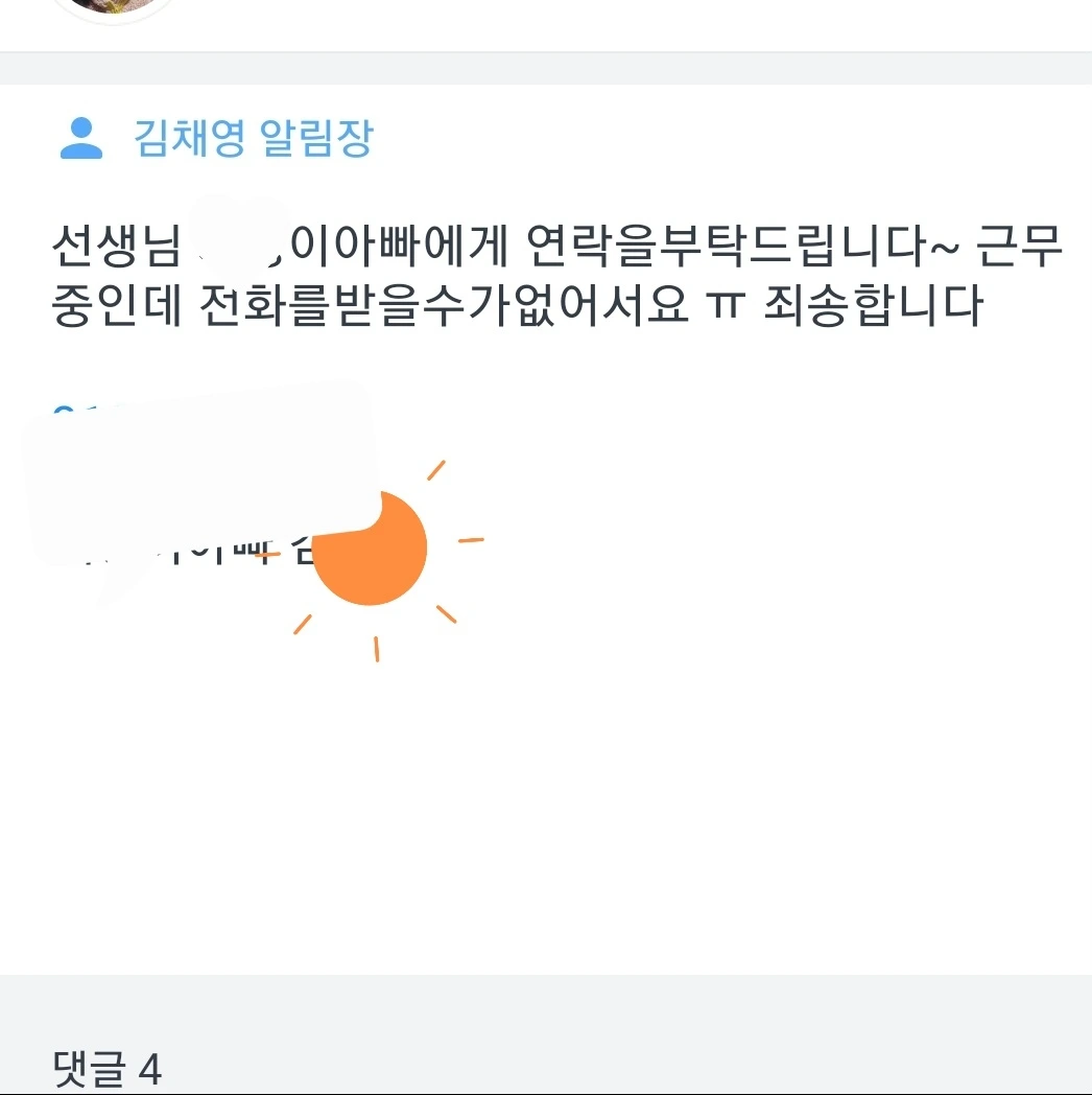 매번 매순간 느꼈던 오묘한 감정들, 그리고 불편한 점들이 있었다. 일을 하면서 일을 똑같이하는데 모든 전화창구가 (연락과 소통이) 보호자 중 엄마가 된다. 간호사로 근무하면서 환자보호자를 만나고 대응하는 순간에 통화하는 것은 불가능하다. 그나마 점심시간? 30분정도의 시간은 전화통화가 유일하게 가능한 시간이다. 하지만 이마저도 여의치않은 경우가 많은데, 내가 점심시간이면 상대방도 점심시간이기 때문이다. 쉬는시간에 학생의 보호자에게 전화하기란 쉬운일이 아니다. 할 이유도 없고..