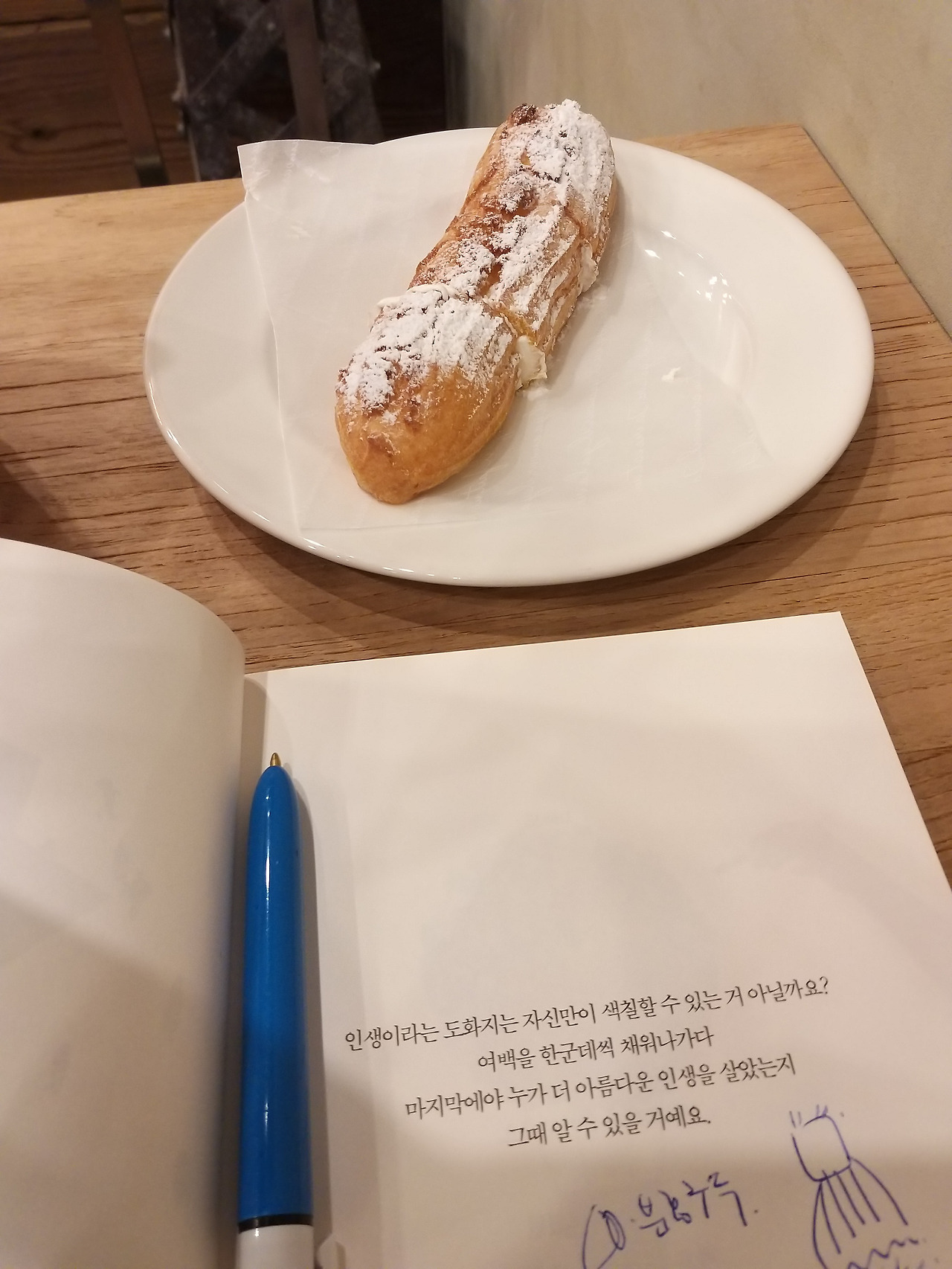 유난히 뜨겁던 한여름날, 갓난아기를 유모차에 태우고 간 그곳은 시원은 커피가 있었고 나에게는 안식처였고 힐링 그 자체였다. 그곳에서 나는 책도 보고 커피도 마셨다. 초등학교에 갓 입학한 딸아이를 기다리기도 했고 잠자는 아이를 바라보기도 했다. 그리고 그런 휴식 끝에 나의 첫 책이 탄생했다. 지금도 도도한 빵쟁이 카페에는 나의 첫 책이 자리한다.