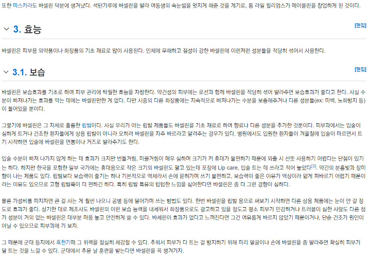 평소 알고지낸 바셀린을 검색해보니 새로운 것도 알게된다. 마스카라도 바셀린 덕분에 생겨난 거라고 한다. 석탄가루에 바셀린을 발라 여동생의 속눈썹을 멋지게 해준 것을 계기로, 톰 라일 윌리엄스가 메이블린을 창업하게 된 것이라니! 바셀린을 찾아보지 않았다면 평생 모르고 지나갈 뻔했다.