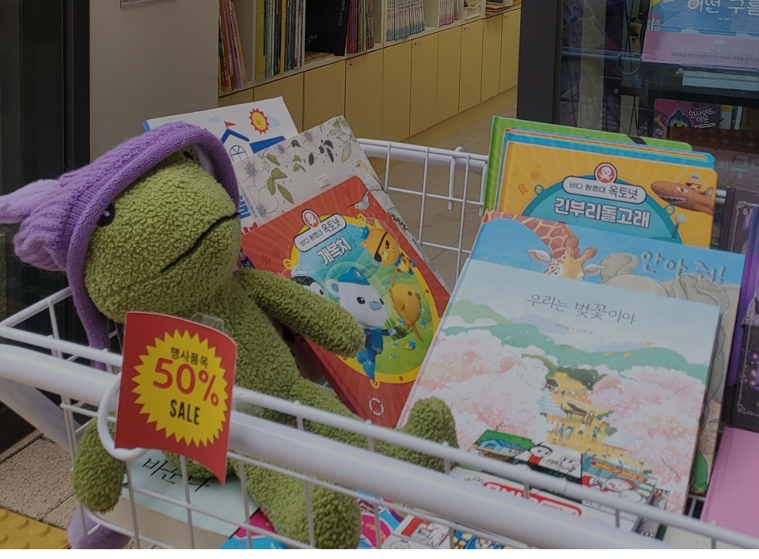 반려묘의 생필품이나 먹거리, 숨숨집 (고양이가 숨어지내는 집), 캣타워 등 고양이의 용품세계를 아주 다양하고 많았고 가격도 천차만별, 비싼 것도 많았다. 이것저것 다 살수는 없으니, 아이들과 상의하기도 하고 필요한 물품들은 그때그때 주문해보기로 했다. 책방을 운영하고 있기에 사업자가 있으니, 반려동물을 위한 물품입점도 기대해볼 만 했다. 내가 책방을 여는 시점부터 구상하고 계획했던 것 중에 하나는 그림책과 다양한 물품, 아이템이 연결되면 좋겠다는 생각이었다. 예를 들어, 사과 그림책 옆에 사과가! 개구리 우산 그림책 옆에 개구리 인형이나 (지금도 책방 앞 가판대에 보라색모자를 쓴 개구리인형이 자리해있다!) 우산이 있는 것이다. 수박 그림책 옆에 수박과일 모형이 있고, 된장찌개 그림책 옆에 냄비받침이 있듯이 말이다. (실제로 된장찌개 그림책을 구매한 사람들에게 냄비받침을 선물로 주기도 했었다)