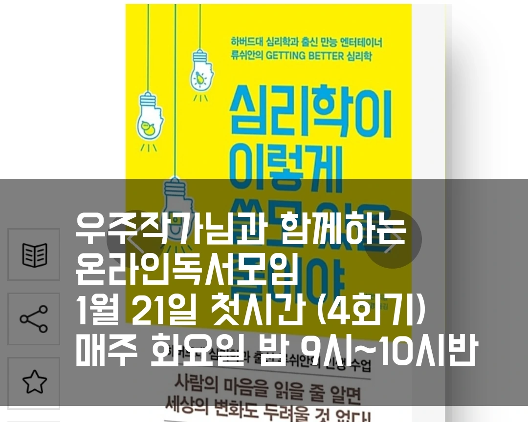 줌온라인이 처음인 경우도 있었지만, 무리없이 수업이 진행되었을 뿐더러 서로간에 소통하고 책에 관한 이야기를 나누는 분위기가 자연스럽게 스며들었다. 온라인이라는 방식임에도 불구하고 (밤 늦은시간이었지만)적극적이고 편안한 분위기에서 책에 관한 이야기를 나눌 수 있어 좋았다는 후기가 인상적이었다. 다음 온라인독서모임은 1월 21일에 예정되어 있다. <심리학이 이토록 쓸모있을 줄이야> 책을 몇 페이지라도 읽고 참여한다면 더 좋을 것 같다. 평소 접하기 어려웠던 분야라면 더욱 환영이다. 이번 기회에 심리학에 관한 이야기를 풀어내보는 건 어떨까? 함께 참여하는 분들의 생각도 들어보는 건 어떨까?