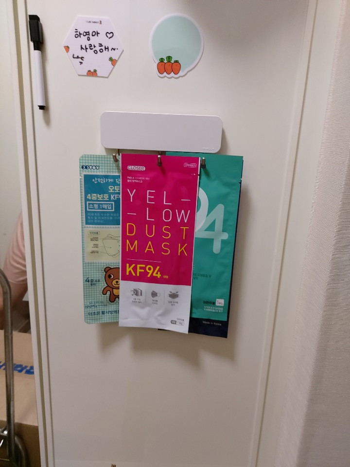 현관에 자리한 마스크 걸이. 아이돌보미 선생님이 너무 좋은 아이디어라고 칭찬해주었다. 신발을 다 신고 현관 밖으로 나간 남편이 아차차 마스크 안 가지고 왔다며 몇 번을 돌아왔다. 다시 가져다주기 귀찮아 아예 현관 옆에 만들어버렸다. 마스크 보관함. 급할 때 집 밖을 나갈 때, 그 때 그 때 필요하면 가져갈 수 있도록 마련해둔 것이다. 나도 출근하다보면 깜빡깜빡 한다. 아이도 마찬가지다. 마스크가 요즘 필수이다. 외출할 때는 물론, 엘리베이터를 탈 때도 마스크를 하지 않으면 안된다. 늘 구비해두고 손이 닿는 편한 곳에 준비해 두어야 겠다.