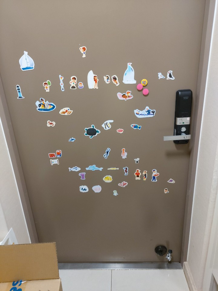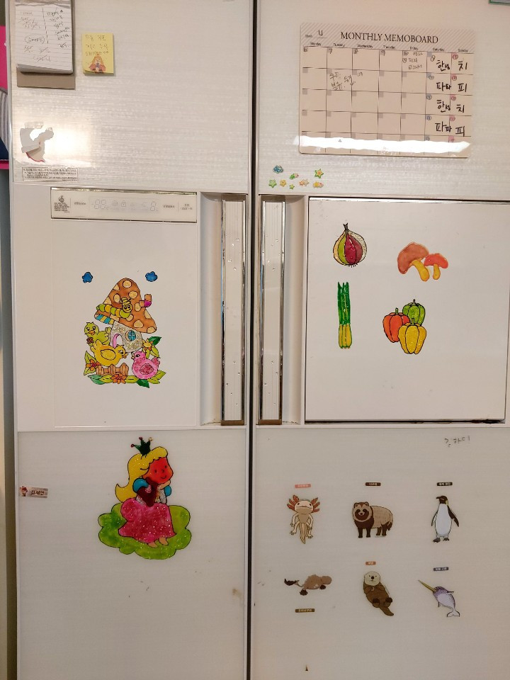 매일 지나다니는 문은 현관문이다. 마트를 갈 때도, 차를 탈 때도, 외출하고 어린이집 가고 학교 갈 때도 우리는 늘상 이 현관문을 지나다닌다. 칙칙한 색깔의 현관문에 알록 달록한 자석 꼬맹이들로 도배를 하였다. (집 안에는 왜 이렇게 회색 빛깔의 어두운 색이 많은지!) 나름의 스토리를 가지고 자그맣고 큰 자석들을 여기저기에 혼자서 작업했다. 둘째 아이가 어린이집을 갈 때도 현관문에 붙여진 자석을 보고 그림을 본다. 첫째 아이가 학교를 갈 때도 자석들에 눈이 갈 것이다.