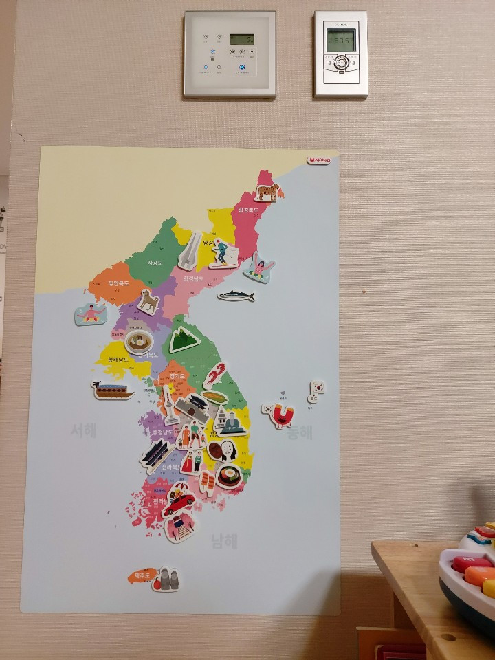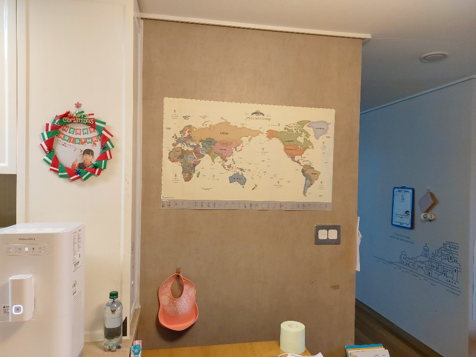 평소 밥을 먹는 자리에서도 널찍한 회색벽면이 보기가 싫었는데, 어느 날 파스텔 톤의 세계지도를 주문했다. 몇 달동안 고민을 해오다가 결정하고 주문을 한 것이다. 아이는 밥을 먹다가도 앞의 벽면에 붙여져 있는 세계지도를 보기도 하고 선생님과 이야기도 나눈다고 했다.