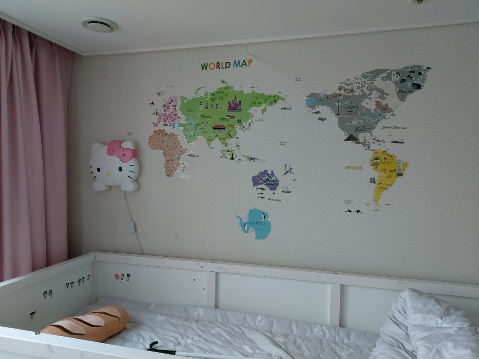 먼저 휑했던 아이 방 벽에 이마트에서 봐두었던 세계 지도 스티커를 딸아이와 함께 붙였다. 아이는 세계지도를 좋아한다. 역사도 좋아한다. 어느 나라가 어디 위치해 있는 지, 국기는 어떤 모양인지 벽에 세계지도를 붙여두니 자주 들여다본 이유인 것 같다. 잠을 자려다가도 잠이 오지 않으면 한참을 세계지도 그림판을 바라본다고 했다. 자신의 상상의 나래에서 어디도 가보고 싶고 생각을 하겠지?