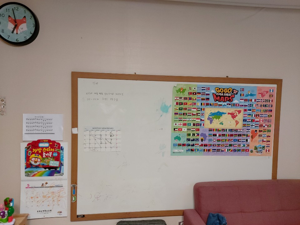 여차여차 해서 얼렁뚱땅 정말 그렇게 못질을 겨우겨우하고 화이트 보드 보드 칠판을 벽에 장착했다. 커다란 화이트 보드는 거실 분위기를 색다르게 만들어주었다. 책에서 기억남는 구절을 적기도 했다. 아이는 커다란 대형 화이트보드 칠판을 유독 좋아했다. 다양한 화이트보드 펜들을 가지고 그림도 그리고 낙서도 했다 글자를 배워가는 시기라 영어도 쓰고 한글도 따라적었다. 요즘에는 아이돌보미 선생님과의 소통도 이 칠판이 대신한다. 둘째 아이 분유먹은 시간, 간식은 어떤 걸 챙겨주었는지,, 나는 나 대로 목욕시켜 주세요~ 병원 가는 날 등을 화이트 보드에 기록해둔다. 모두가 이 공간을 이용하며 하루에 몇 번씩을 보는 것이다.