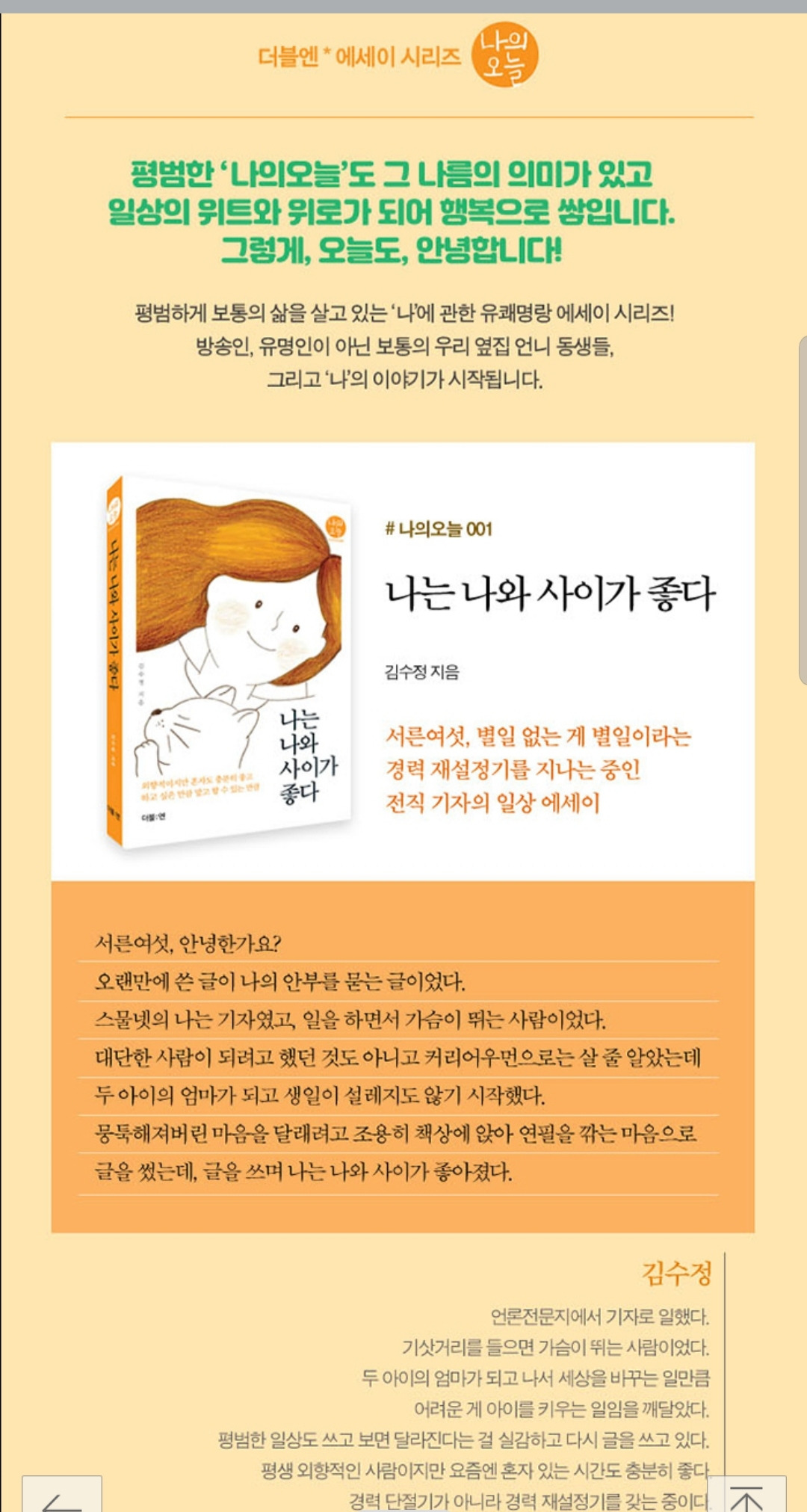 그리고 ' 나의 오늘 에세이' 첫번째 시리즈가 드디어 세상에 나왔다. <나는 나와 사이가 좋다> 를 집필한 김수정 작가는 우연히 글쓰기 모임에 참여하게 되면서 지금의 편집장님을 만나 책으로 엮게 되었다. 기자로 생활했었는데 결혼하고 두 아이를 키우며 눈코뜰새없이 바쁜 생활을 했을 그녀였다. 무심코 흘러가는 반복되는 일상이지만 지금의 감정을, 그리고 나를 찾고 싶었는지도 모른다. 글을 쓰면서 나를 더욱 알게되었고 나와 더욱 사이가 좋아졌을 것이다.
