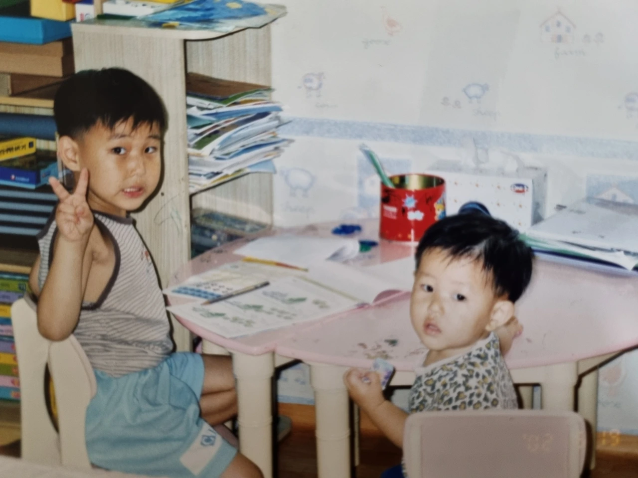 분리형 작은책상(사진을 우연히 찾았다).큰애와 막내.형이 나름 공부하는데 덩달아 옆에 앉아있는 막내