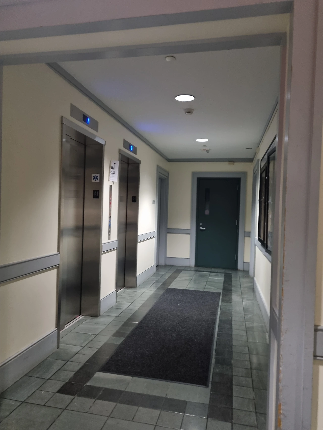 드울프기숙사현관 이중문. 출입가드를 통해 오간다. 문이 아주 육중하다. 기숙사마다 스타일과 개성이 다 다르다. 드울프는 현대식이다.