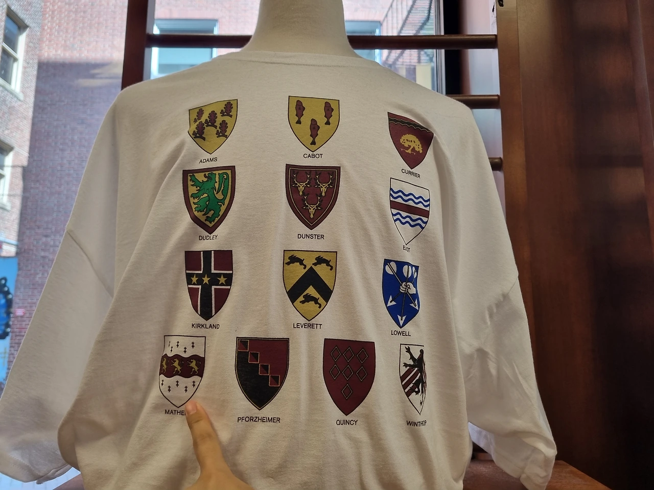 기숙사상징 엠블럼이 박힌 티셔츠. 막내가 매더기숙사를 손으로 가리키고 있다.오른쪽은 하버드칼리지내 기숙사중 하나 .주로1학년이 거주하는데 고풍스러우나 오래되어 수시로 공사한다.