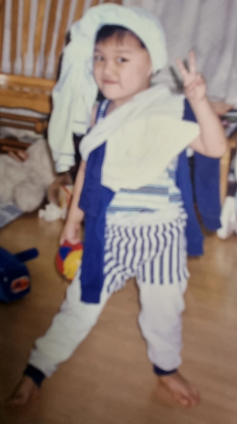 손에 들고있는 애착인형. 옷은 왜 저러나..형제끼리 놀이하느라 옷을 저렇게 입었던 거 같다.
