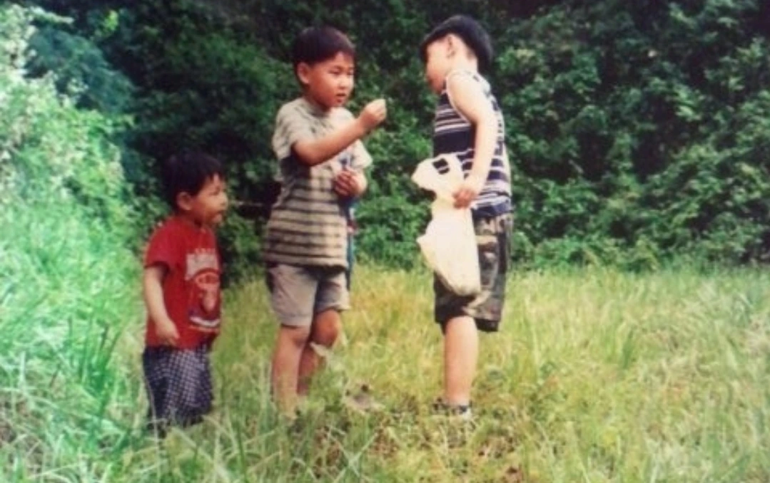 내가 좋아하는 사진. 큰애가 둘째에게 " 이 풀벌레 이름은 뭐야?"하고 묻는 장면이다. 막내는 형들이 뭐하나 궁금해 쳐다본다. 형 옷을 물려입는 막내의 바지가 크다..