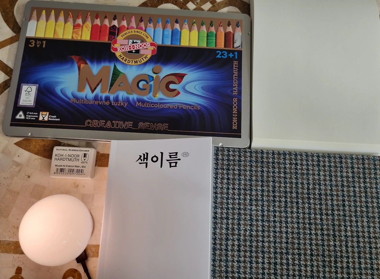 세상에 이렇게 예쁜 색연필이있나 싶은 고운 색연필과 작은 스케치북, 모직으로 짠 촉감이 좋은 겉표지를 지닌 노트와 우리말 색이름사전과 지우개와 브런치 글 쓸 때 분위기 좋게 켜고 있으라고 작은 LED 등까지. 귀엽고 사랑스럽고 정감 있는 선물을 다양하게도 준비해 왔다. 둘째는 선물을 전하면서 "엄마가 브런치작가이시니 작가에게 어울릴 만한 선물을 하고 싶었다"고 말한다. 색연필로 글에 넣는 그림을 그리셔도 좋을 거 같다고.
