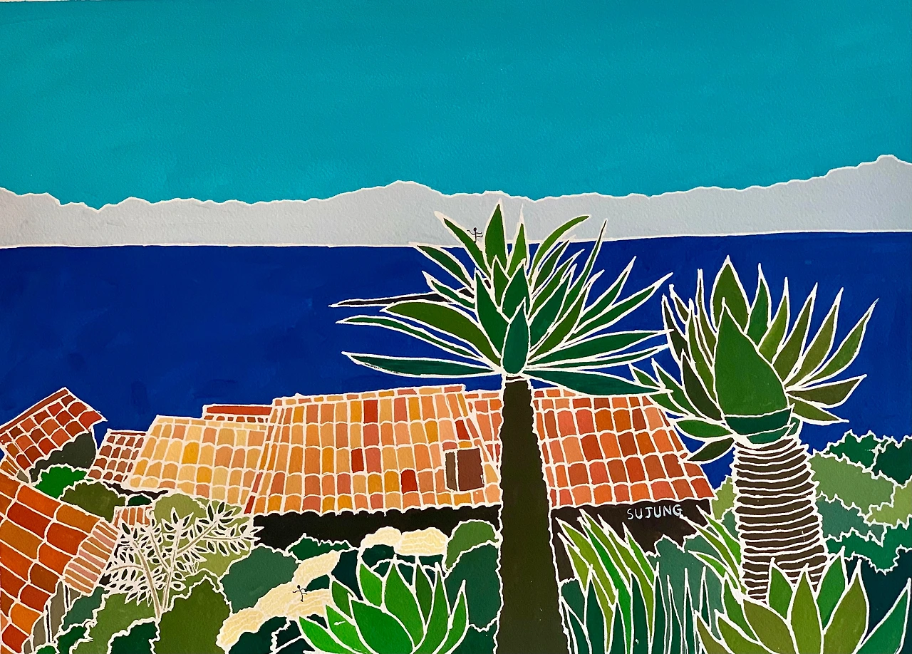 ✈ 그림 설명: 남프랑스 에즈(Eze)에 있는 에즈빌라쥐라는 정원을 종이에 과슈로 그렸습니다. 에즈는 400M 높이의 언덕에 조성된 마을로 꼬불꼬불한 중세 언덕길이 멋집니다. 골목골목마다 아기자기한 갤러리, 공방, 기념품점이 이어집니다. 까까지른 절벽에서 지중해를 바라보며 와인을 즐길 수 있는 식당도 있습니다. 니체가 에즈를 거닐며 <짜라투스트라는 이렇게 말했다>의 영감을 얻었다고 합니다.