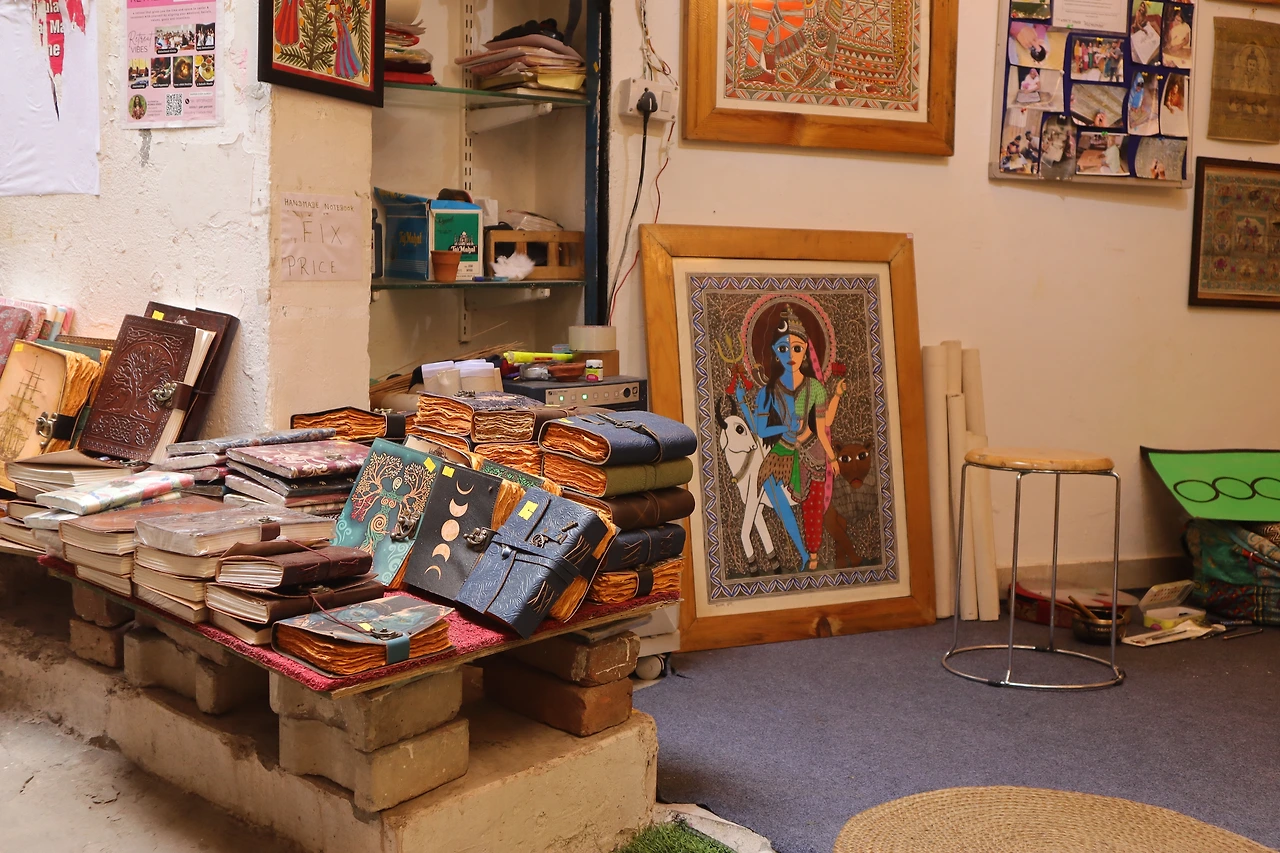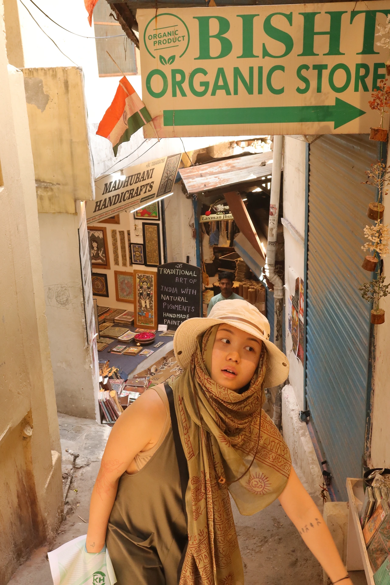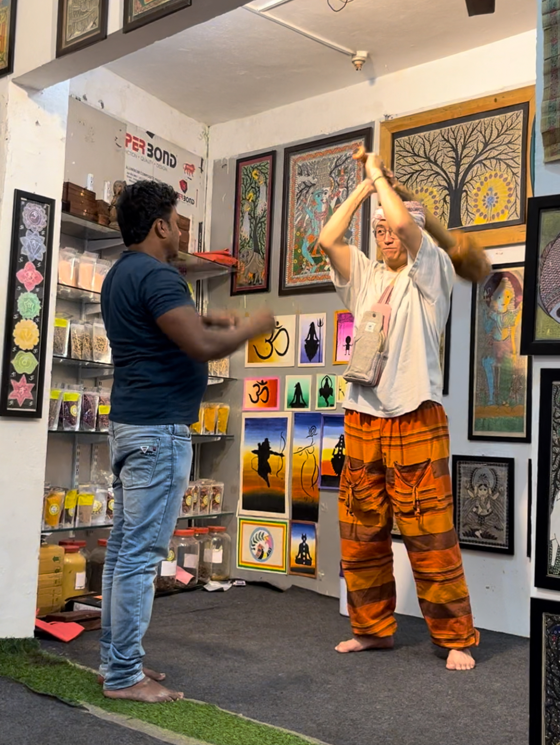 본격적으로 쇼핑 시작이다. 요가를 하러 인도에 왔지만 정작 매트를 안 가져와서 하나씩 구매하기로 했다. 인센스, 팔로산토, 아로마 오일 등을 취급하는 잡화점에 들어간다. 마음에 쏙 드는 매트가 없어 고민하던 찰나 사장님이 직접 써보고 구매하라며 위층으로 따라오라고 한다. 창고 겸 요가원으로 사용되는 스튜디오에 한국에서 구경하기도 힘든 종류의 매트들이 차곡차곡 정리되어 있다. 천, 코르크, 우레탄 등 재료도 갖가지. 우리는 코르크로 된 가벼운 재질의 매트를 선택했다. 가격이 조금 부담스러워 여러 가게를 들렀는데 결국 이곳으로 돌아와 구매했다. 사장님 아주 친절하고 호객하지 않고 적극적이다. 요가스트랩도 서비스로 받았다.