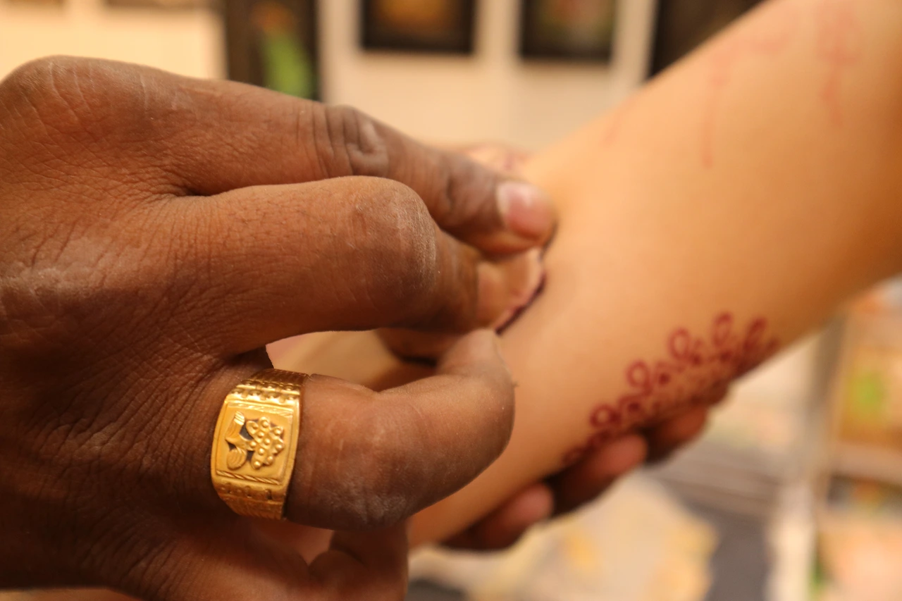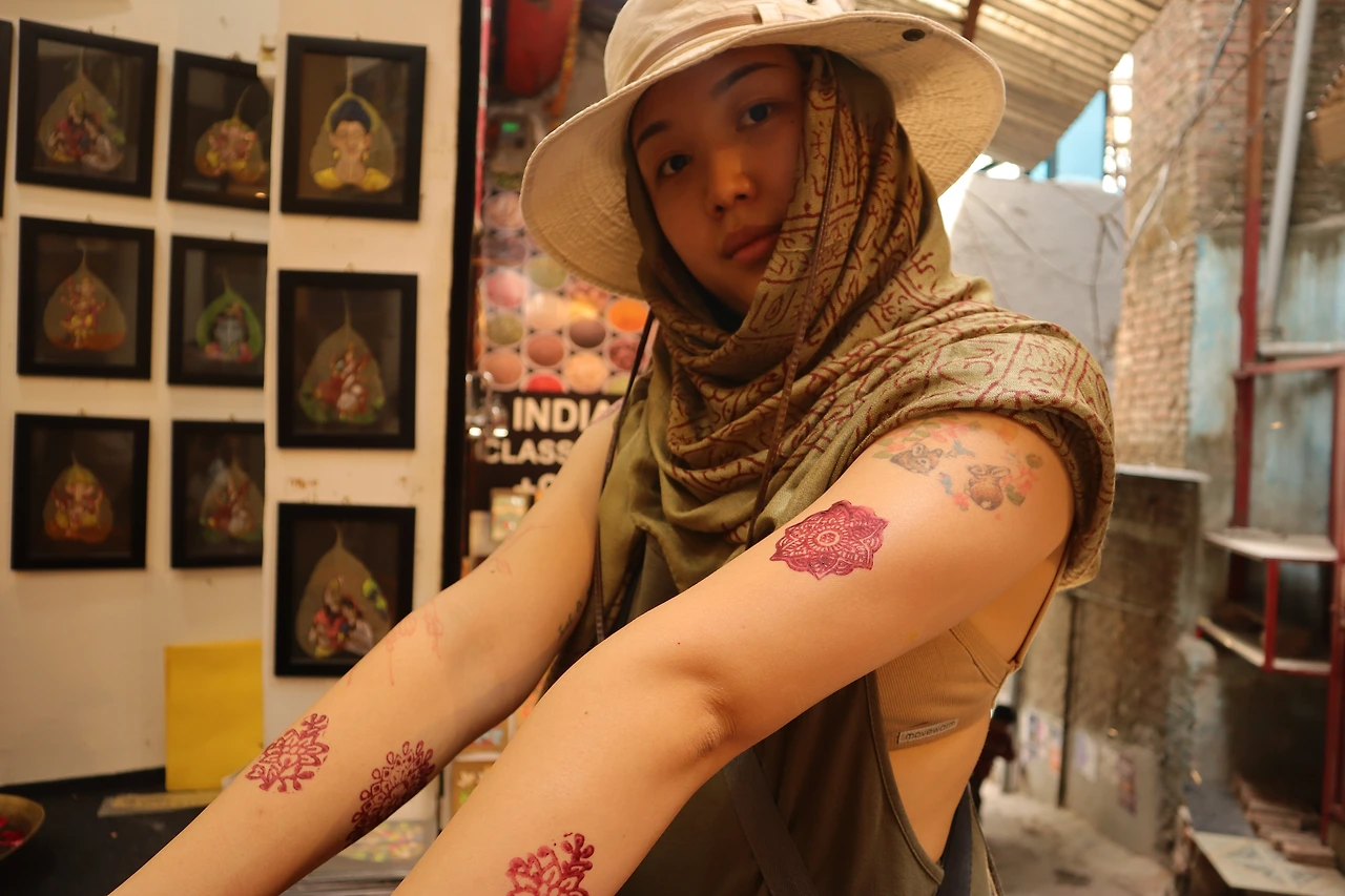 도장으로 찍어주는 즉석 헤나다. 한 번 찍는데 100루피 그러니까 한국돈 1,600원 정도 한다. 3일 정도 유지된다 해서 두 개를 부탁했다.(집에 와서 샤워하고 보니까 거의 지워짐) 모양을 고르고 하나 찍고, 두 번째 찍는데 뭔가 어설프다.