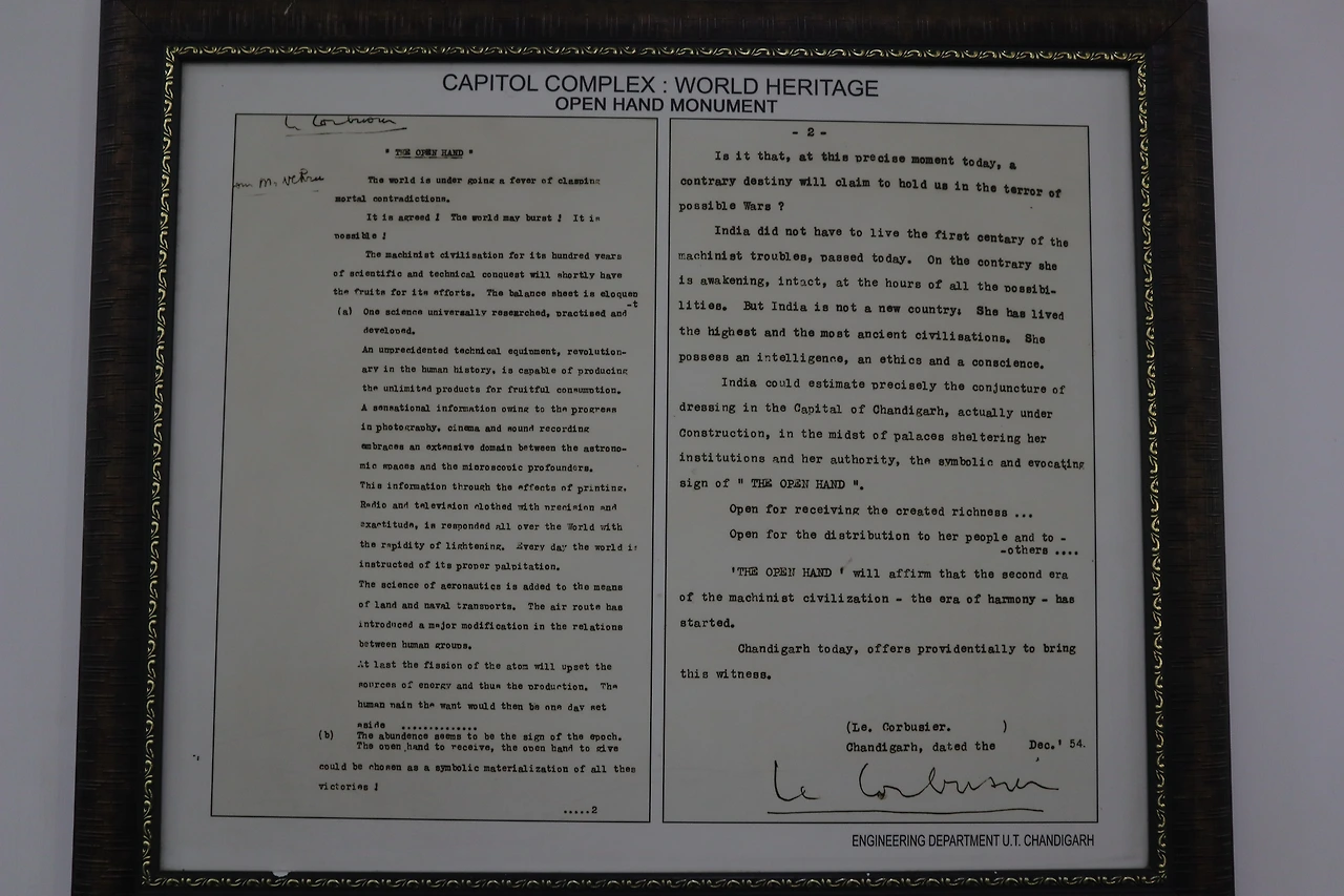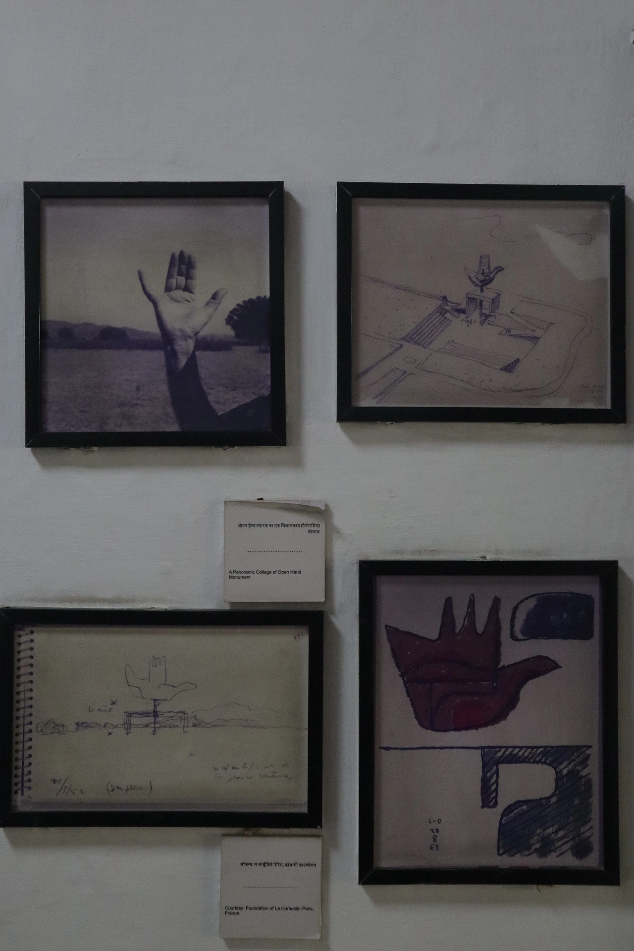 다행히 주변에 그와 찬디가르의 이야기를 담은 작은 박물관 있어 슬쩍 다녀와봤다. 첫 번째 사진에 보이는 상징물은 찬디가르의 심볼로써 활짝 펼쳐진 손에 핵심 연결망을 그려놓은 모양이다. 활짝 펼쳐진 손은 인류의 평화와 번영, 화합을 가져다준다는 의미. 중앙청사 건물 중에는 이 심볼을 이용한 “Open hand”라는 작품도 있다. 재미나게도 이 지역의 지도를 살펴보면 손 모양과 닮았다. 세 손가락에 위치한 네모칸들이 sector 1의 중앙청사 건물들이다.