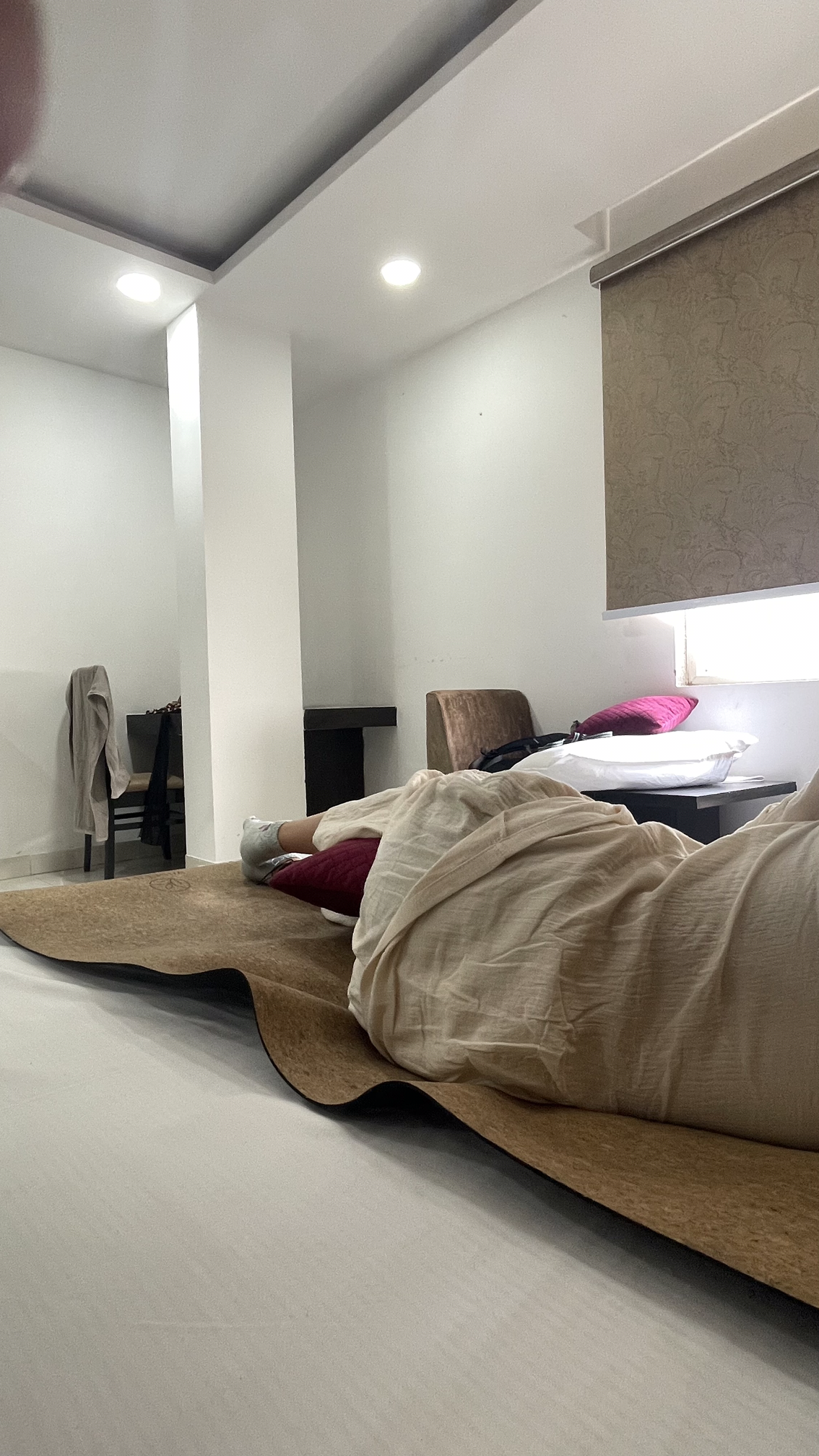 여차저차 하룻밤 묵을 거처를 마련했다. 근처에 있는 가장 저렴한 방을 예약했는데 그마저도 지금까지의 숙소들보다 비싸다. 침대가 지저분해 요가매트를 깔고 자는 처량한 모습.