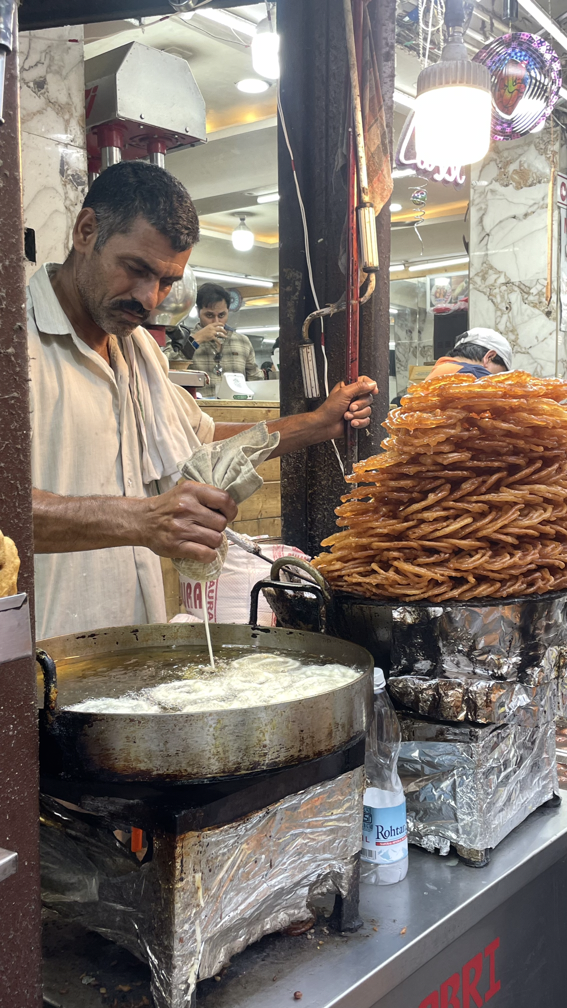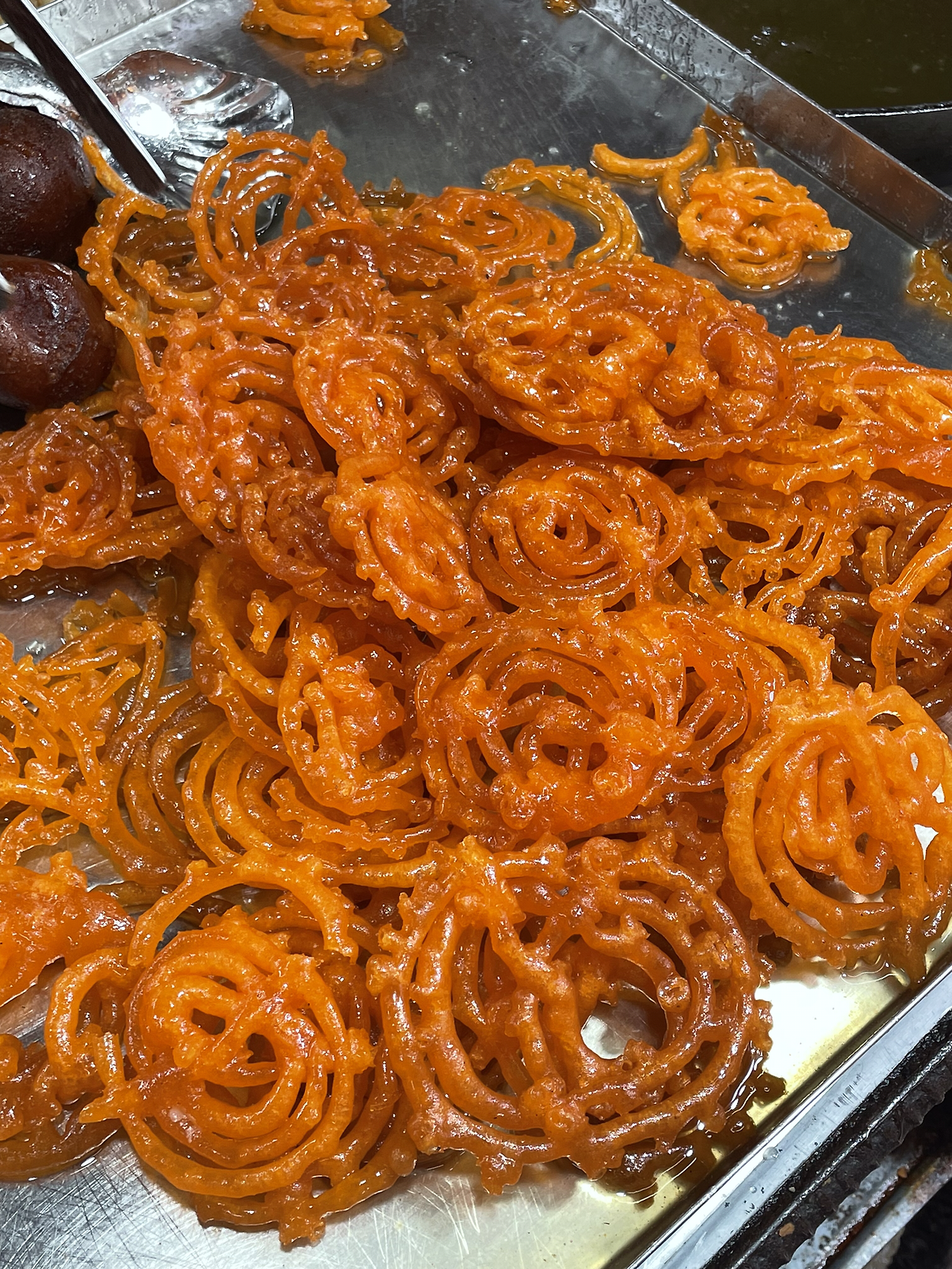 역시나 어딜 가나 볼 수 있는 대표간식 잘레비. 밀가루를… 튀겨서… 설탕에 절인.. 것. 인도에서 몇 없는 예상한 맛 그대로의 음식이다. 고열량의 본능적인 맛이지만 두 개 먹으면 다음날 못 일어날 것 같다.