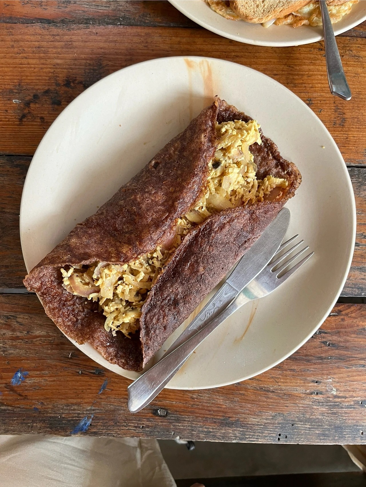 칼슘이 풍부하고 고혈압 예방에 효과적인 손가락조(Finger millet)로 반죽한 크레이프에 달걀과 양파, 버섯으로 속을 채운 것이다. 글루텐이 없어 거친 식감이 우리의 전병 같은 고소한 맛을 낸다. 밀가루가 아니라 속에도 부담이 없어 아침식사로 뚝딱!