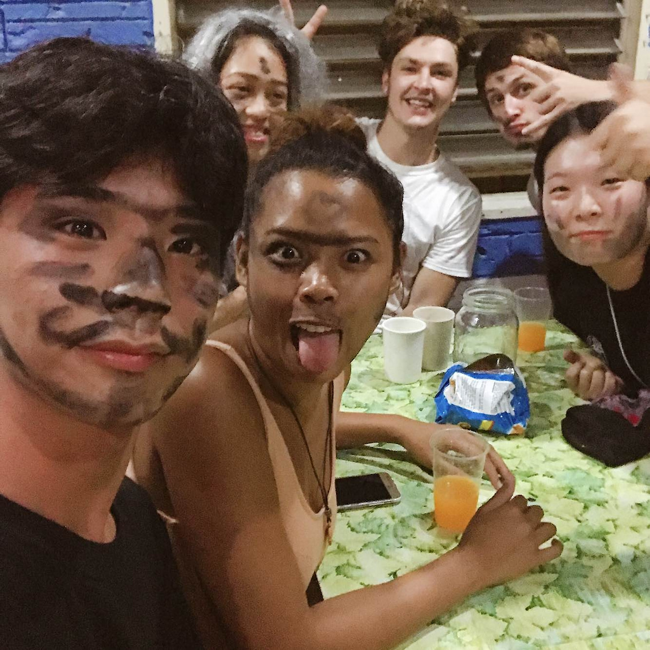 그야말로 대 환장 파티였다. 타워 두 개를 세워두고 술 게임 하나를 시작한 지 1시간도 안되어 사람들 중 절반은 취해버렸고 벌칙으로 인해 다들 만신창이가 되어버렸다. 저 거뭇한 것들은 옆에서 바비큐를 한 뒤 남은 숯덩이를 나무에 갈아서 염료로 이용했던 것이다. 이름은 기억나질 않지만 우리나라의 '007 빵!'같은 게임을 2시간 넘게 하니 슬슬 지루해졌는지 누군가 다른 게임을 제안했다.
