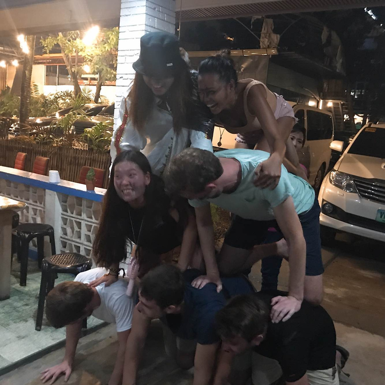 이건 그냥 먹고 죽자는 것 같은데... 열 명이 조금 넘는 인원을 두 그룹으로 나눠 술잔을 채운다. 룰은 간단! 술잔을 비우고 테이블에서 손가락으로 잔을 튕겨 한 바퀴 플립 한 뒤 안정적으로 착지시키면 성공! 그다음 사람이 이어간다. 이 릴레이 방식은 사람들에게 숨 돌릴 틈도 주지 않고 계속 들이붓게 만들었다. 벌칙은 인간 피라미드, 정말 다행인 건 다들 힘들었는지 두 판만에 두 손을 내려놓고 포기해버렸다.