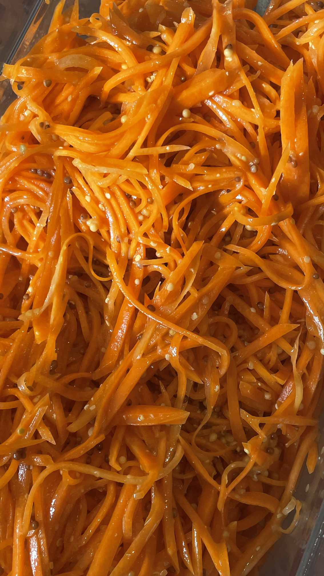 제주의 당근은 정말 달고 맛있습니다. 심지어 국내에서 유일하게 겨울에도 수확되는지라 일 년 내내 신선하고 귀여운 당근을 만나볼 수 있습니다. 재미나게도 시장에 가보면 주스용 당근을 따로 판매하는데 더 작고 옹골찬게 껍질만 벗겨 간식으로 먹기에도 훌륭합니다. 당근에는 베타카로틴이 풍부해 시력증진에 도움이 된다고 하는데 얘네는 지용성비타민이라 기름이랑 같이 섭취해야 흡수율이 높아집니다. 볶아먹거나 올리브오일을 한 스푼 더해줍시다! 머스터드에도 베타카로틴이 풍부하니 깨나 좋은 궁합이라 할 수 있겠습니다.