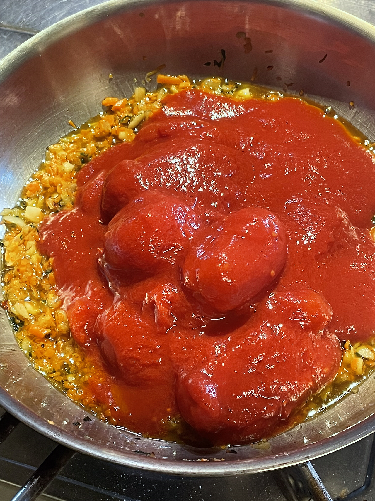 3. 2에 토마토를 전부 넣고 손이나 주걱을 이용해 으깨줍니다. 약간 덩어리가 있어야 복합적인 맛이 나오니 너무 잘게 으깨진 말아주세요.